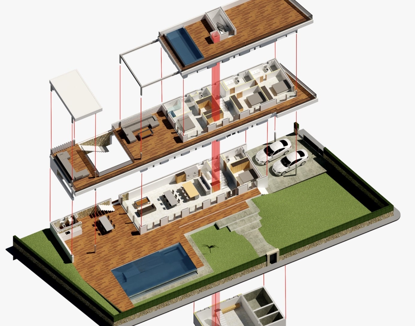 Von dieser Ebene aus wird man Zutritt auf die weitläufige, zum Teil überdachte Terrasse haben mit Außen-Küche, Salzwasser Infinity Pool und einem weiteren Badezimmer.