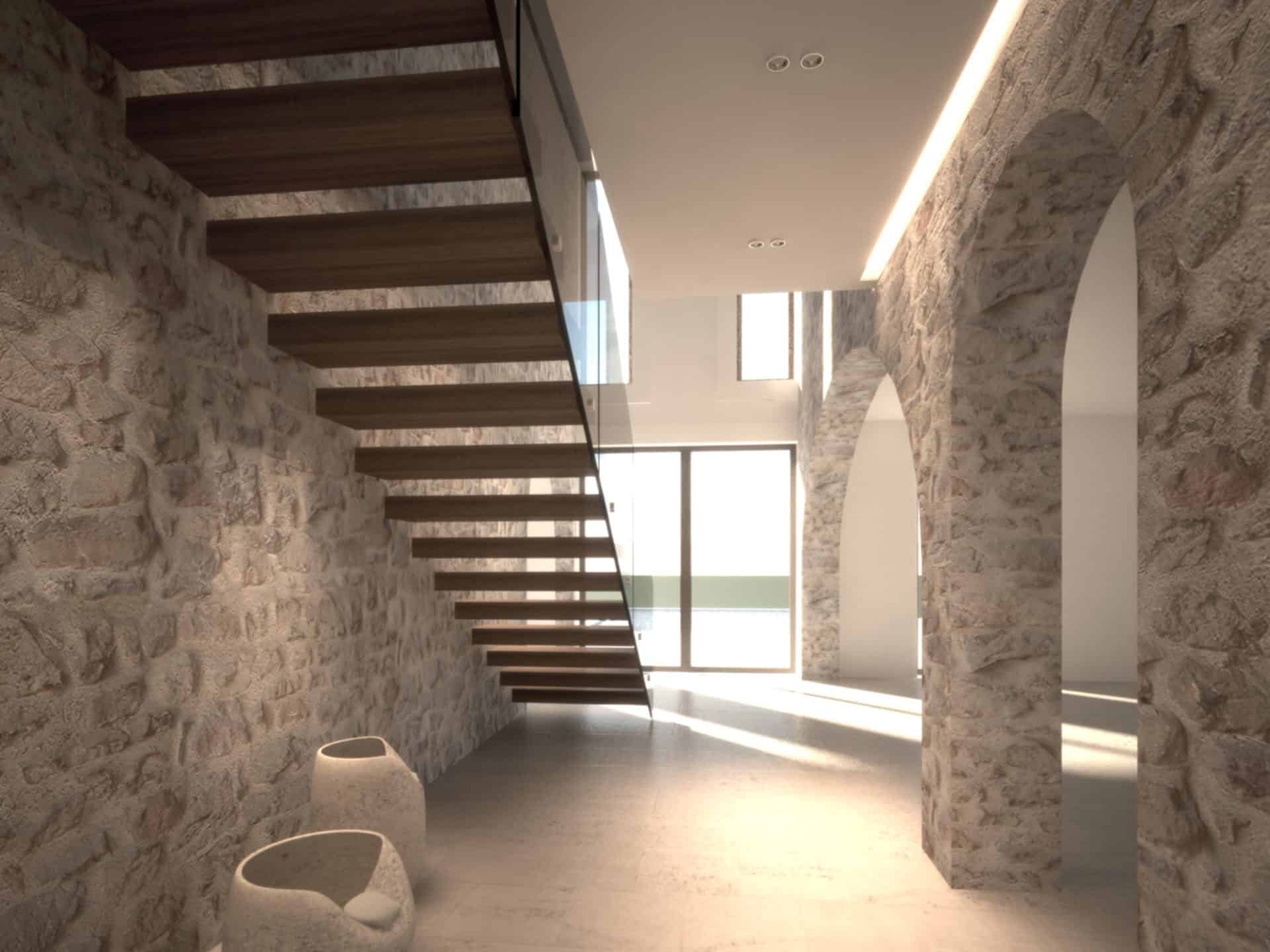 Im Basis Projekt ist eine Finca mit 4 Schlafzimmer mit Bädern en suite geplant, ein großzügiger Wohn-/Essbereich mit offener Küche, das Wohnzimmer wird vom Essbereich durch eine Natursteinmauer getrennt und lädt zum gemütlichen Verweilen ein.