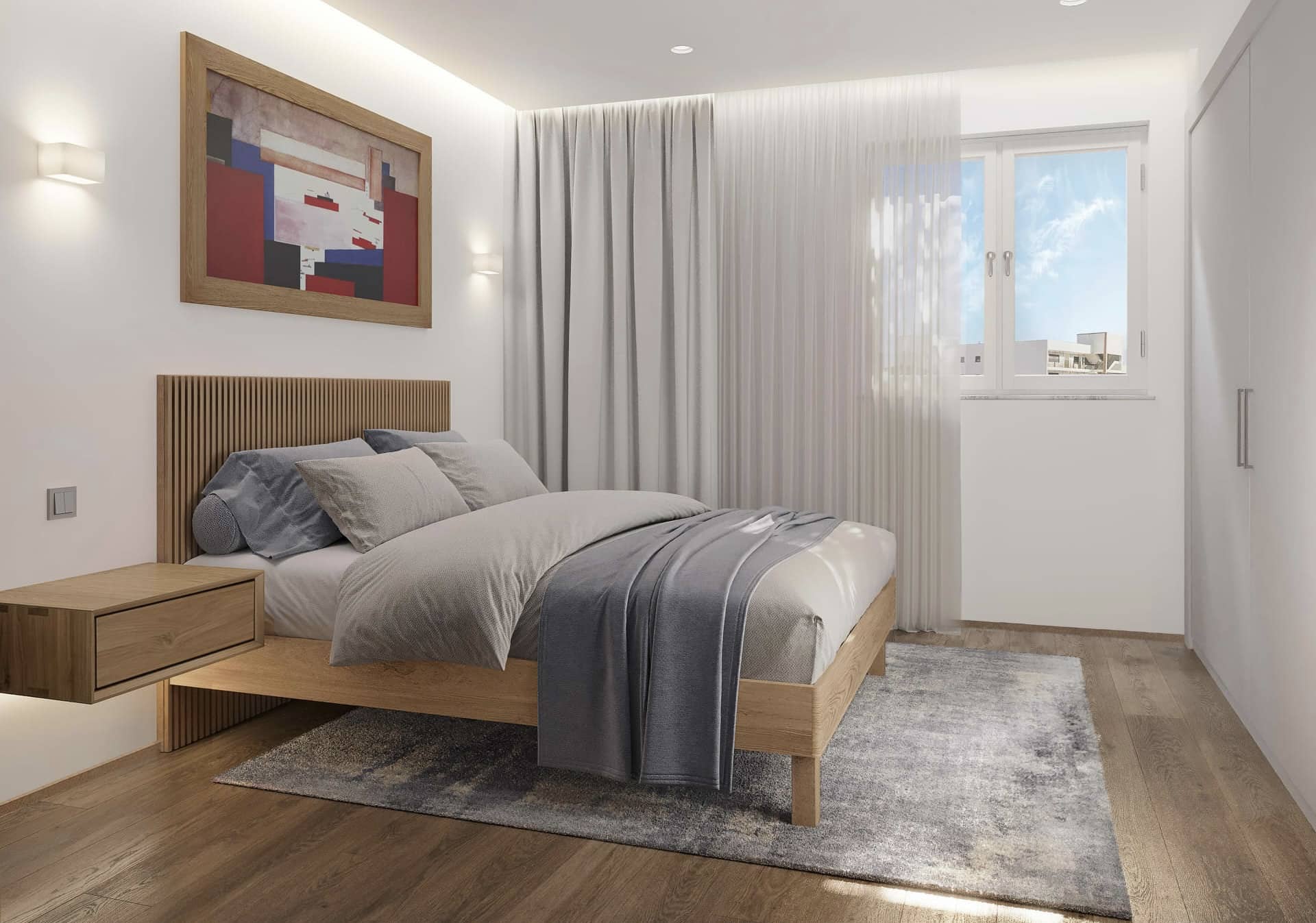Das Innere der Wohnung ist mit einer raffinierten Ästhetik gestaltet, die skandinavischen Minimalismus mit mediterranem Charme verbindet. Es verfügt über einen geräumigen Flur, drei elegante Schlafzimmer, zwei hochwertige Badezimmer und einen hellen, offenen Wohn- und Essbereich. Die schlichte weiße Küche, die mit hochwertigen Geräten, einem Gasherd und einer zentralen Kochinsel ausgestattet ist, bietet einen stilvollen und funktionalen kulinarischen Raum.
