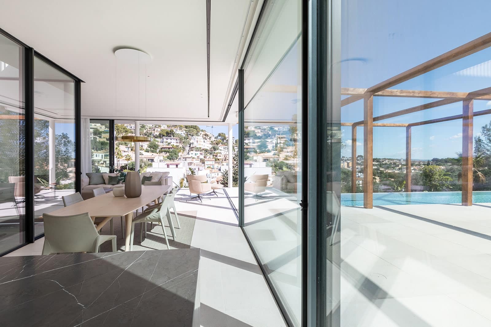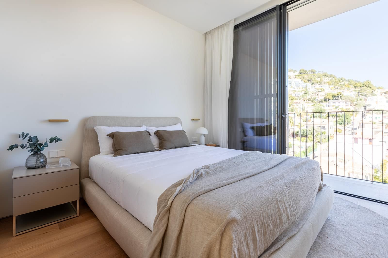 Das mit Pflanzen bestückte Atrium wird das Herzstück des Erdgeschosses sein und den Raum mit natürlichem Licht ausfüllen. Außerdem wird sich die Eingangshalle, das Treppenhaus, ein Hauswirtschaftsraum, ein Doppelschlafzimmer mit eigenem Bad auf dieser Ebene befinden. Das geräumige Küchen-, Ess- und Wohnzimmer wird auf zwei Ebenen angeordnet sein. Der Wohnbereich wird auf einer Seite bis zur Decke verglast sein und bietet einen Blick auf die Ess- und Sitzbereiche von der Terrasse, so dass die Möglichkeiten des Wohnens im Freien optimal genutzt werden können. Im ersten Stock, welcher ebenfalls über eine Außentreppe erreichbar sein wird, werden sich drei weitere Doppelschlafzimmer und Bäder befinden. Zwei davon sind dem Atrium zugewandt, welches für viel Licht sorgt. Diese werden ebenfalls Zugang zu einer gemeinsamen Terrasse mit Blick auf die Landschaft bieten. In diesem modernen mallorquinischen Haus werden erstklassige Konstruktionen, die besten Materialien und hochwertige Geräte verwendet. Die durchgängige Verwendung von hellen Hölzern, Natursteinverkleidungen und viel Glas im Innen- und Außenbereich werden dieses Haus zu einem echten Hingucker machen.