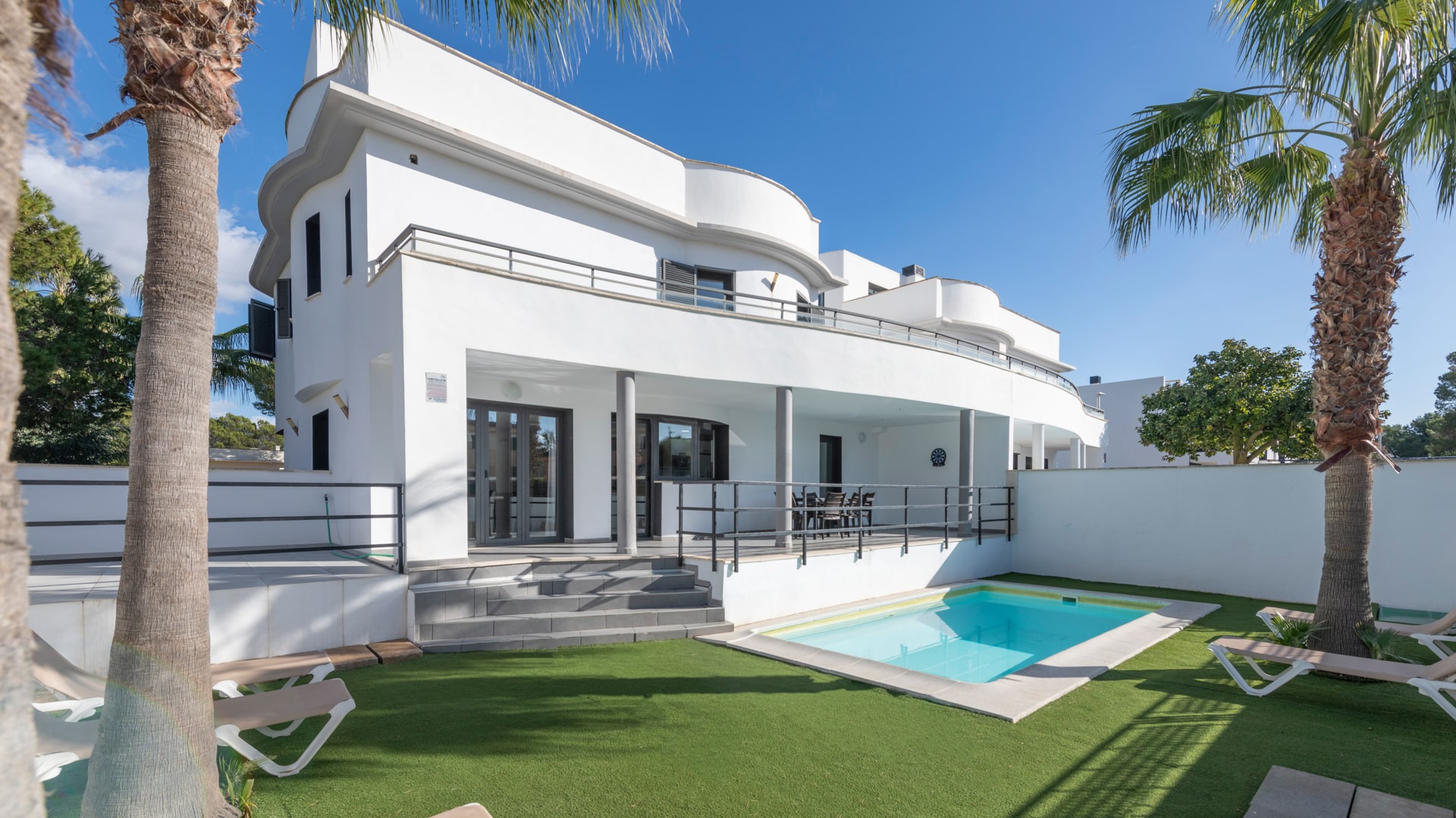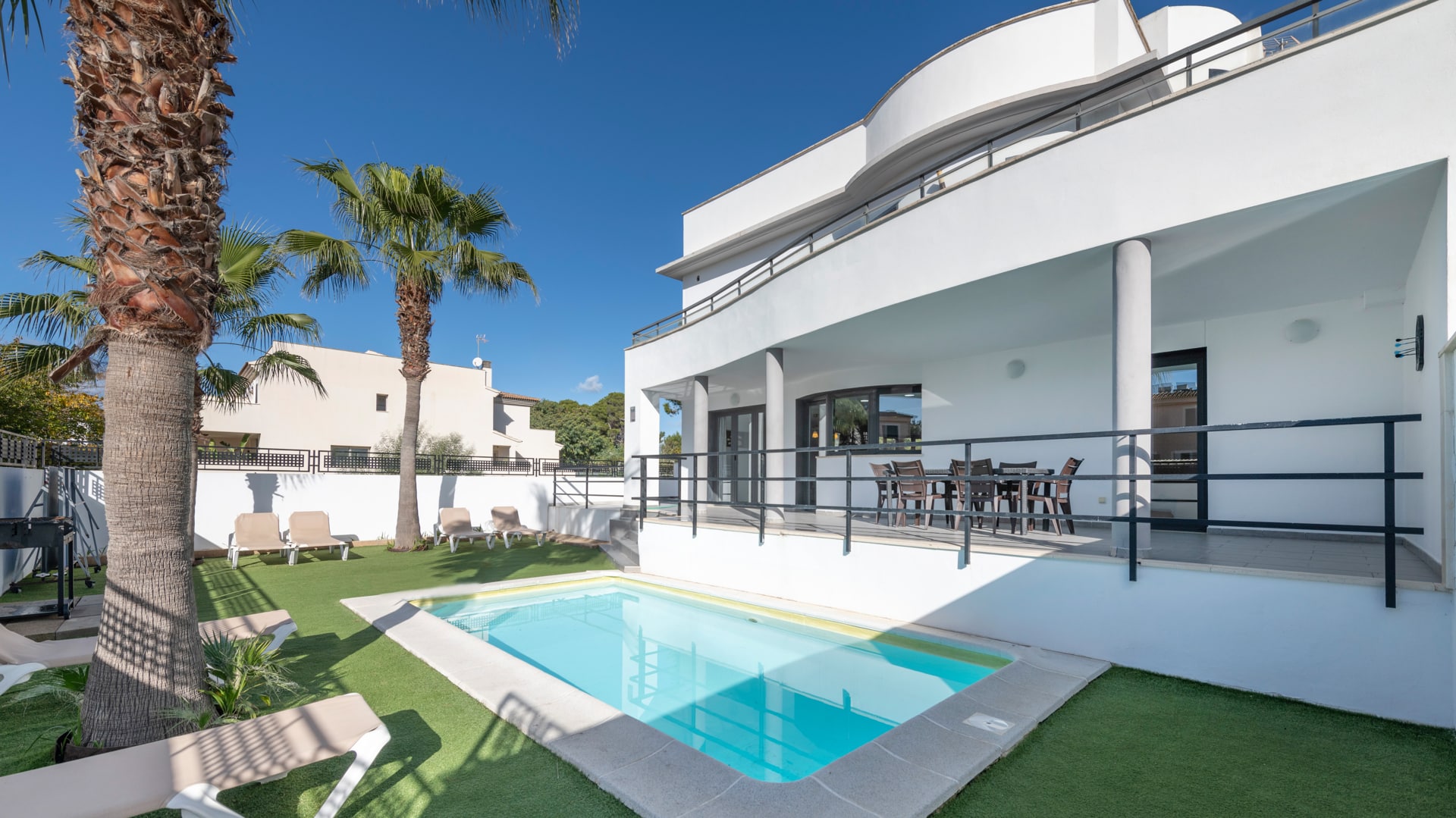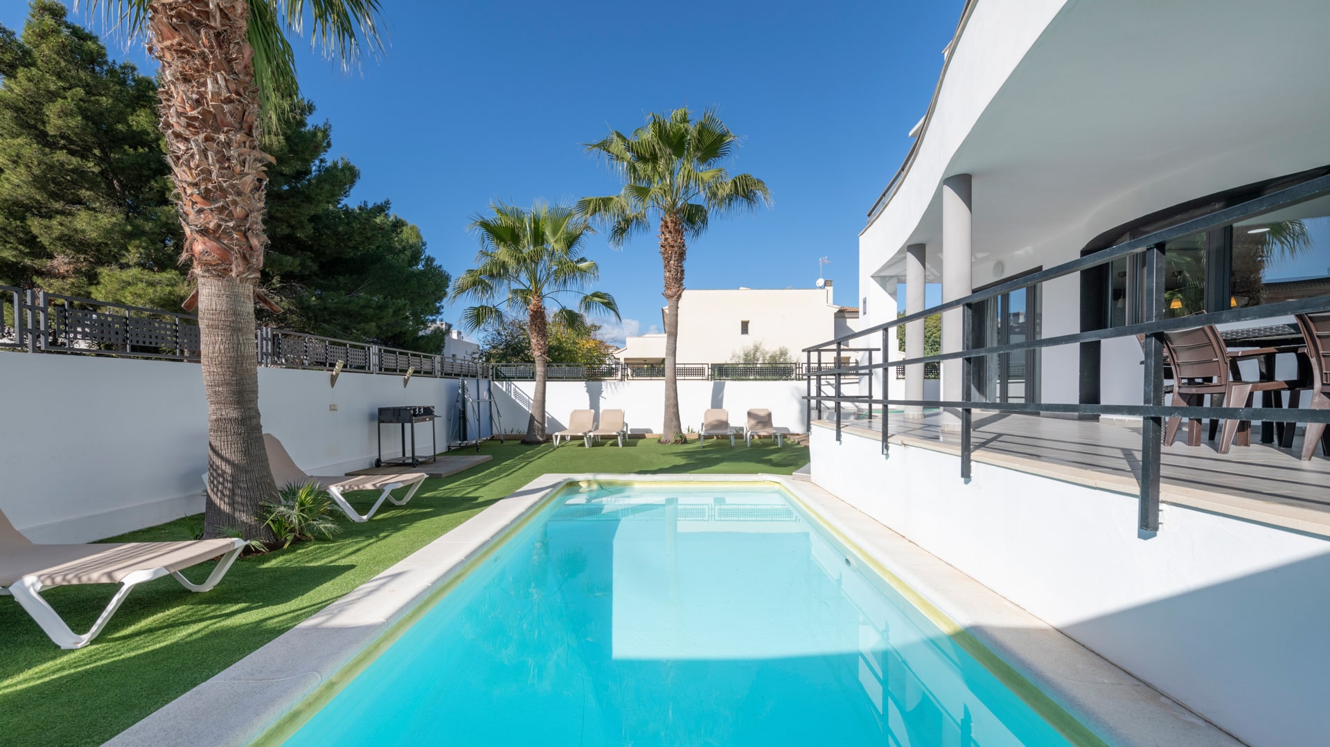 Lage: Diese Villa befindet sich in Cala Estancia, einer der begehrtesten Gegenden von Palma de Mallorca, die für ihre Kombination aus ruhiger Wohnlage und Nähe zum Meer bekannt ist. Nur zwei Straßen vom Strand entfernt, bietet sie direkten Zugang zum weißen Sand und kristallklarem Wasser des Mittelmeers, ein Schlüsselfaktor, der das ganze Jahr über eine hohe Auslastung bei touristischen Vermietungen garantiert.