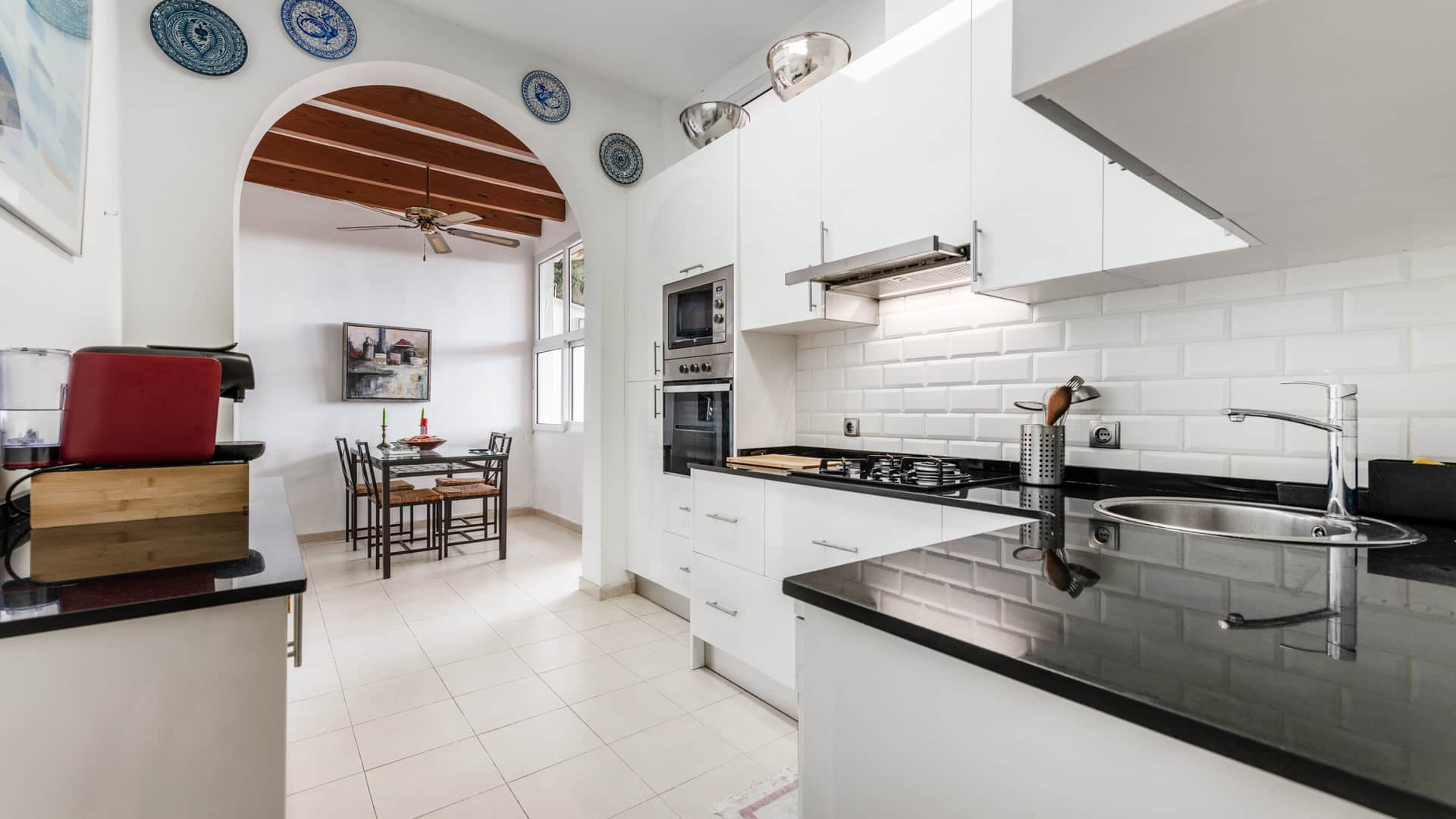 Die Küche, die mit hochwertigen Geräten und modernen Oberflächen ausgestattet ist, kombiniert Funktionalität und Stil, was sie zum perfekten Ort für Gastronomie-Liebhaber macht.