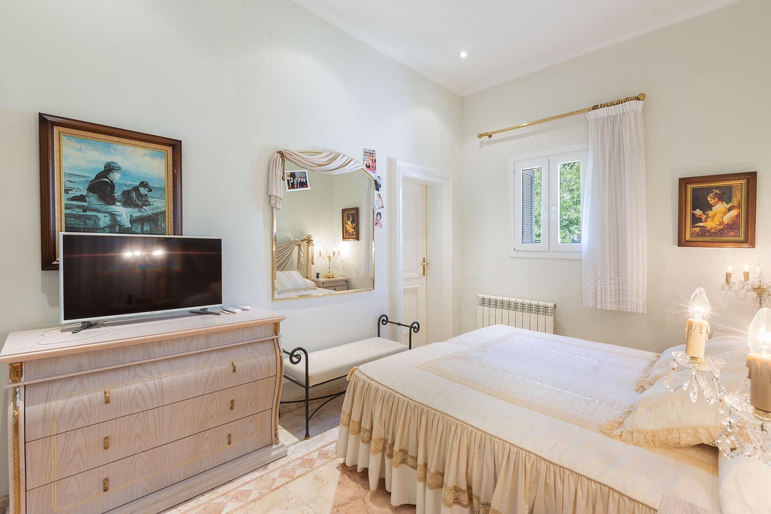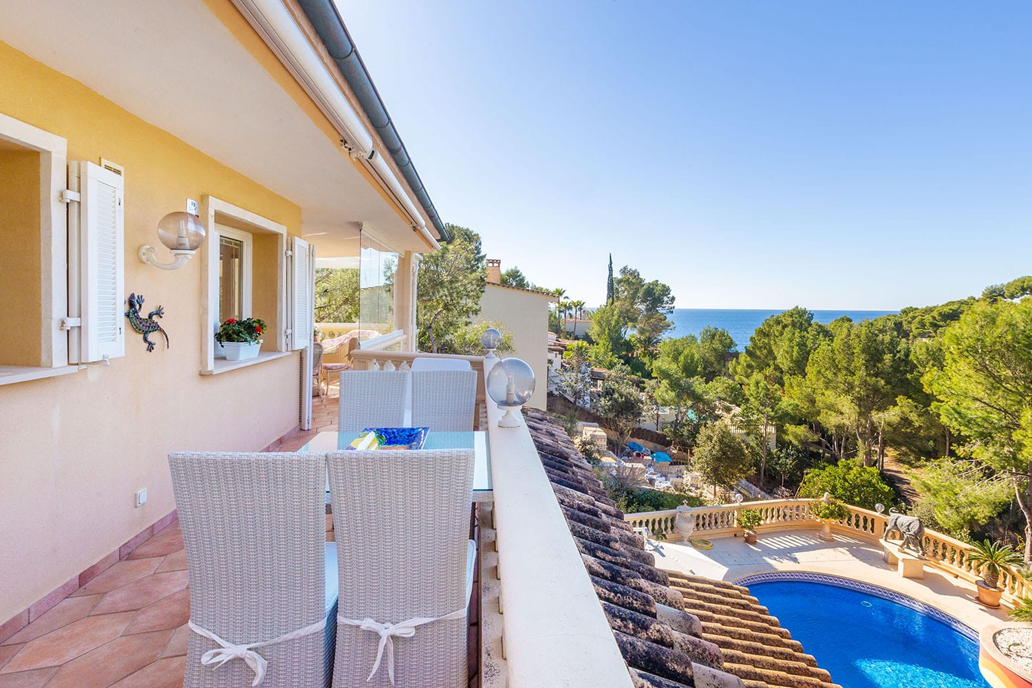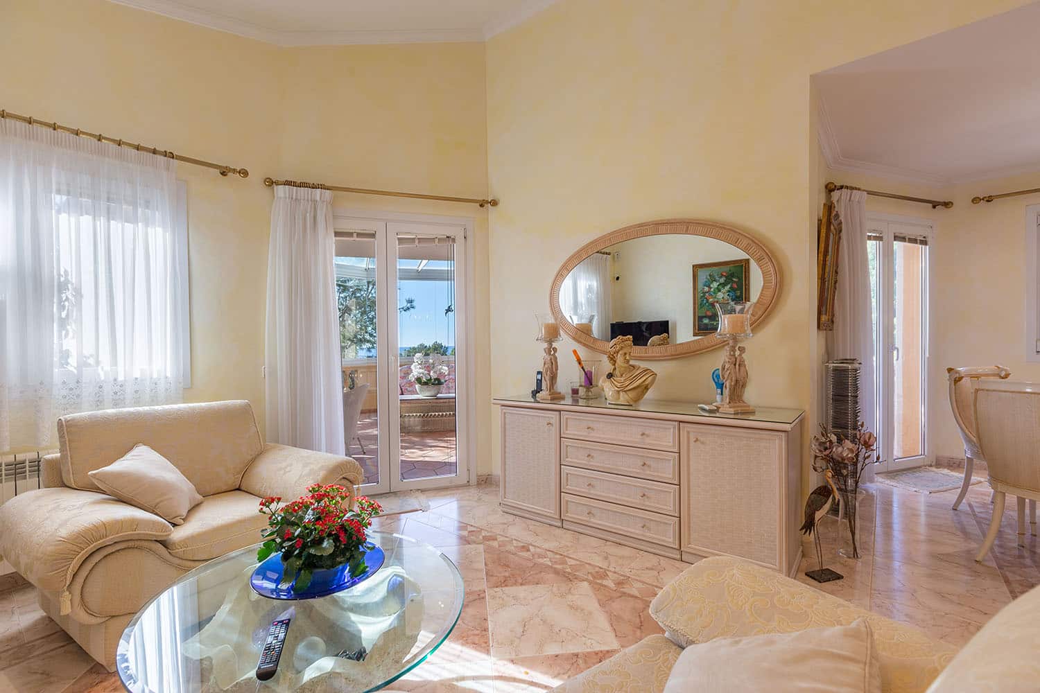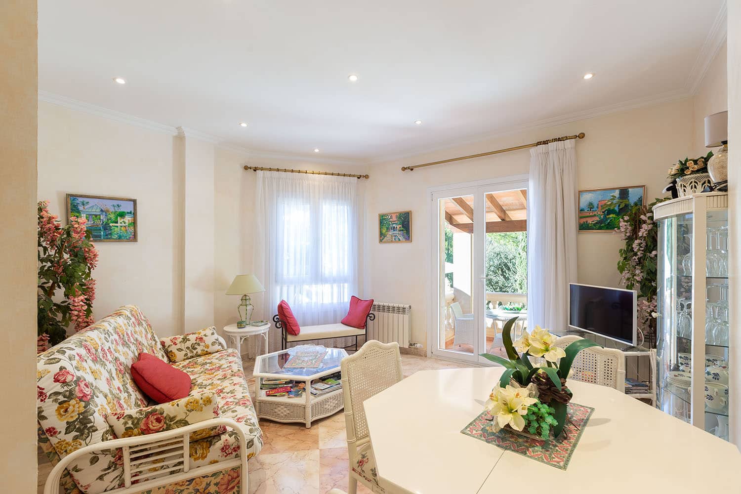 Die Hauptwohnebene befindet sich im oberen Stockwerk und umfasst ein gemütliches Wohn-/Esszimmer, eine separate und voll ausgestattete Küche, zwei geräumige Schlafzimmer mit Bädern en suite sowie eine Gästetoilette. Von dieser Ebene aus gelangt man auf die große, zum Teil überdachte Pool Terrasse mit mehreren gemütlichen Sitz- und Liegemögichkeiten.