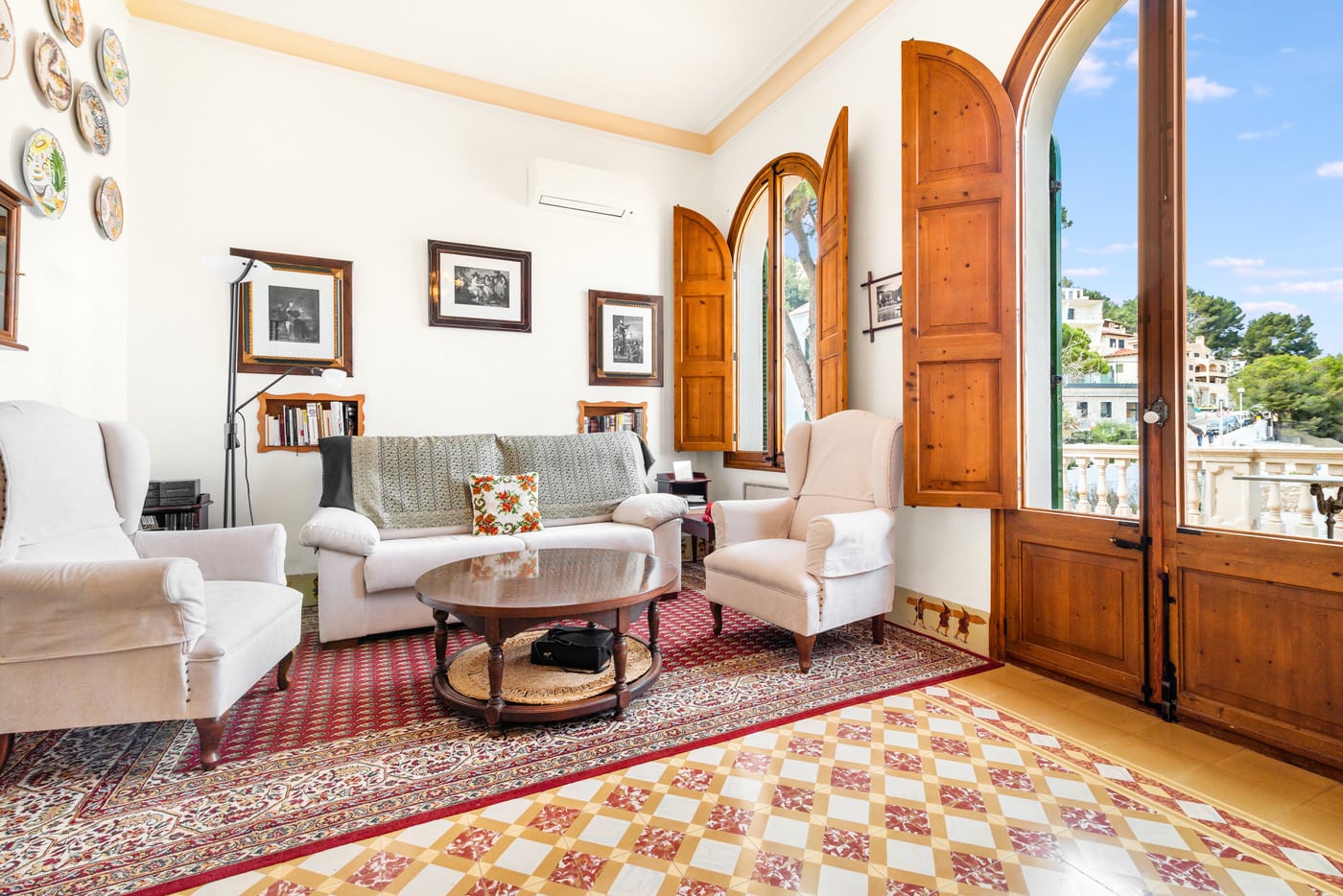 Über eine Treppe gelangen Sie in den Eingangsbereich ausgestattet mit antiken Möbeln, ein sehr komfortables Wohnzimmer mit Kamin und Zugang zur Terrasse, von der Sie einen einzigartigen Ausblick auf den Hafen und das Tramuntanagebirge genießen. Weitere zwei Schlafzimmer und eine voll ausgestattet Küche mit angrenzend Esszimmer befinden sich auf dieser Ebene. Über einen Aufzug gelangen Sie in das Obergeschoss mit seinen 2 Hauptschlafzimmern mit netten Balkonen, weiteren 2 Schlafzimmern und ein Badezimmer. Des Weiteren befinden sich auf dieser Ebene der Hauswirtschaftsraum und Einbauschränke. Sehr praktisch ist die Sommerküche und der Weinkeller im Untergeschoss sowie die Abstellräume, wo Sie genügend Platz für Strandliegen, Sportgeräte und Fahrräder haben.