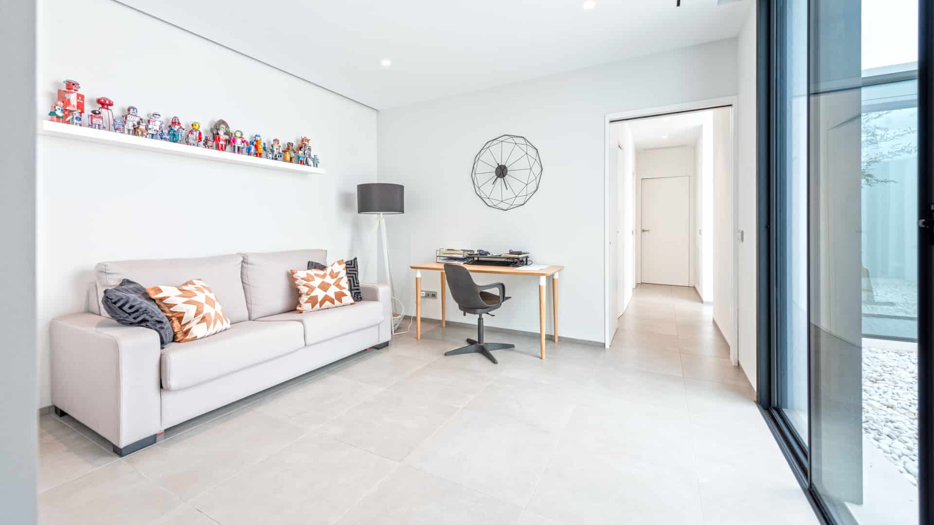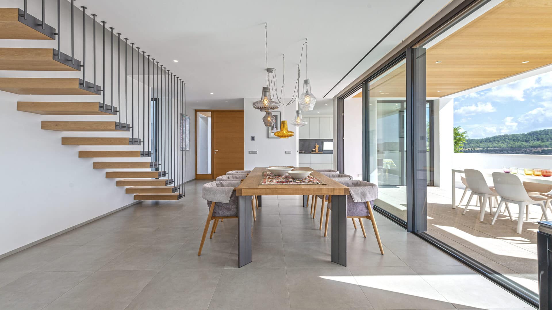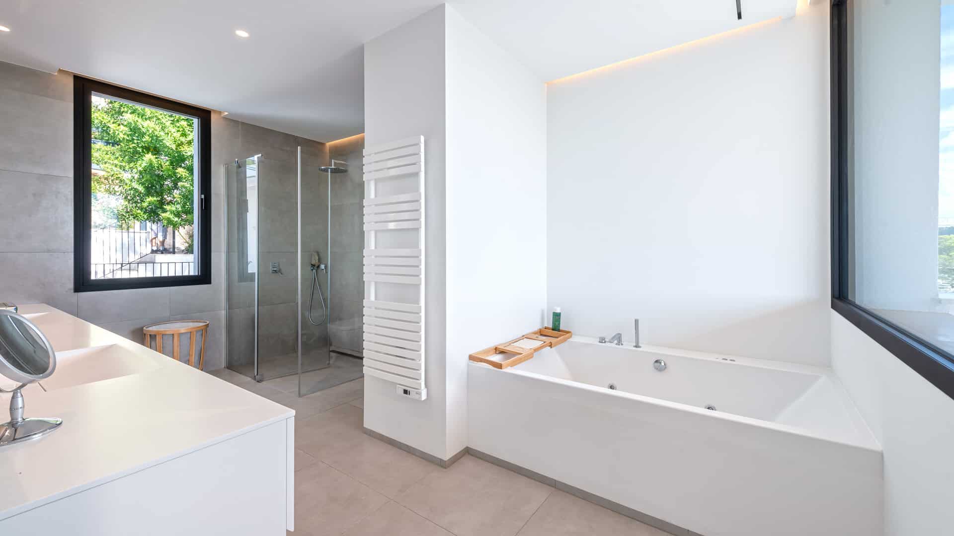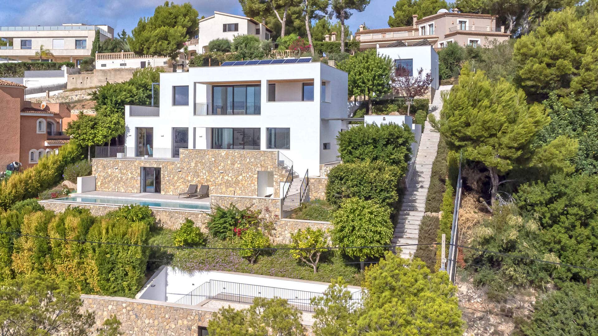 Das Grundstück von ca. 1.276 m² befindet sich in einer ruhigen Urbanisation, am Rande des Dorfes. Das Anwesen hat eine Wohnfläche von ca. 360 m² und verteilt sich auf vier Etagen wie folgt: ein großer Wohn-/Essbereich mit Kamin, eine voll ausgestattete und offene Küche, fünf Schlafzimmer, fünf Bäder und mehrere teilweise überdachte Terrassen. Der Außenbereich des Hauses bietet eine Terrasse hinter dem Grundstück, die sich am höchsten Punkt des Grundstücks befindet, einen Pool und ein Studio mit eigenem Bad, das als Gästezimmer genutzt werden kann. Eine Garage für zwei Fahrzeuge und ein Aufzug runden dieses Angebot ab.