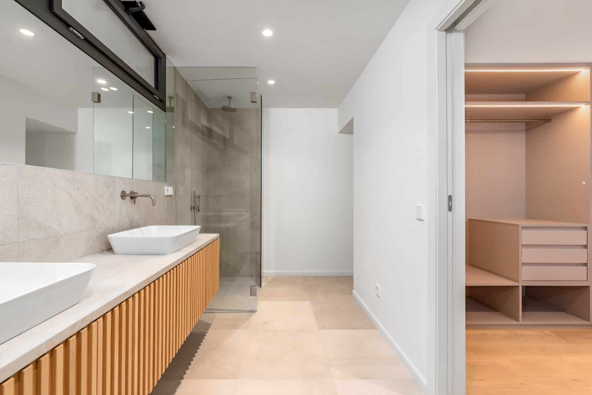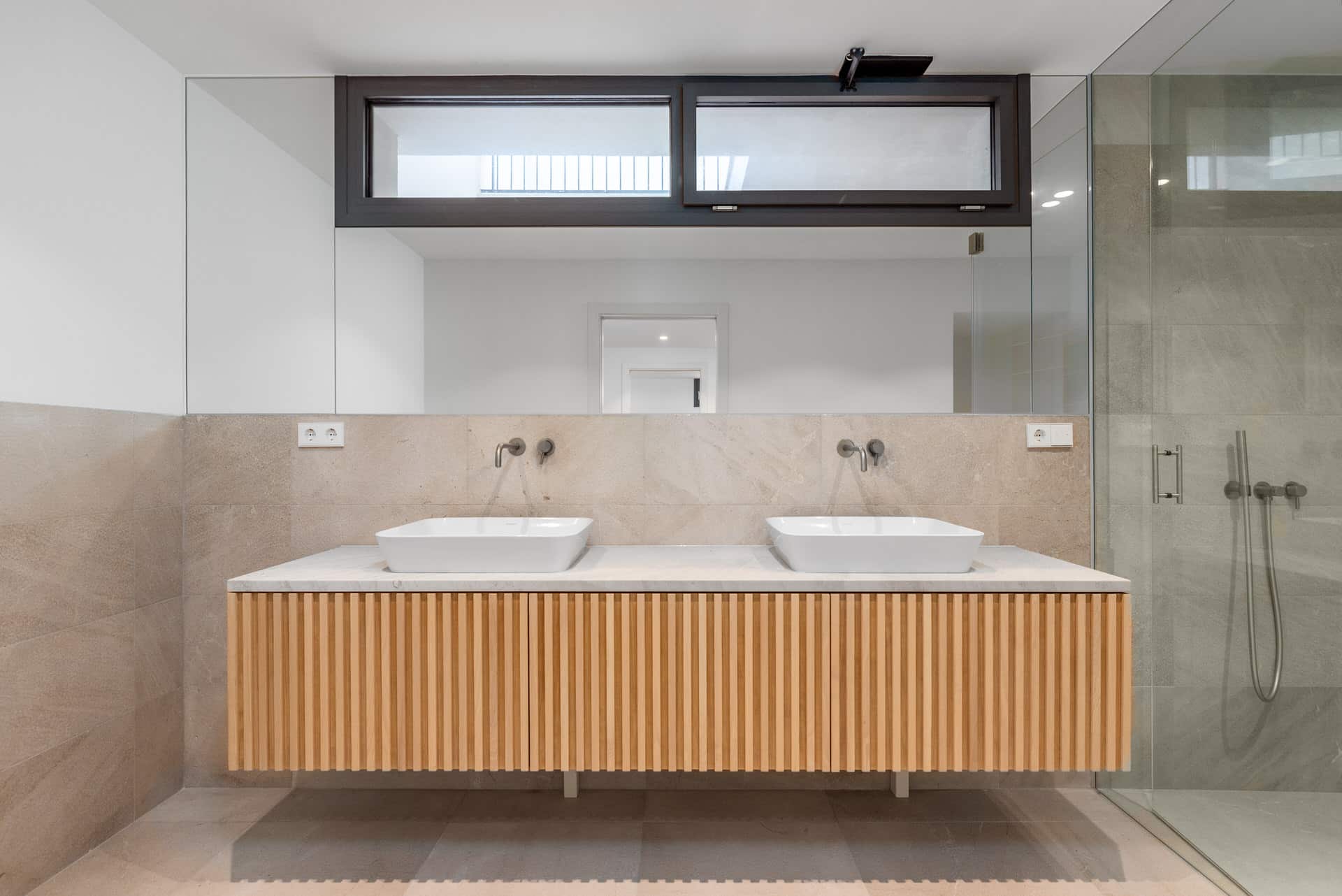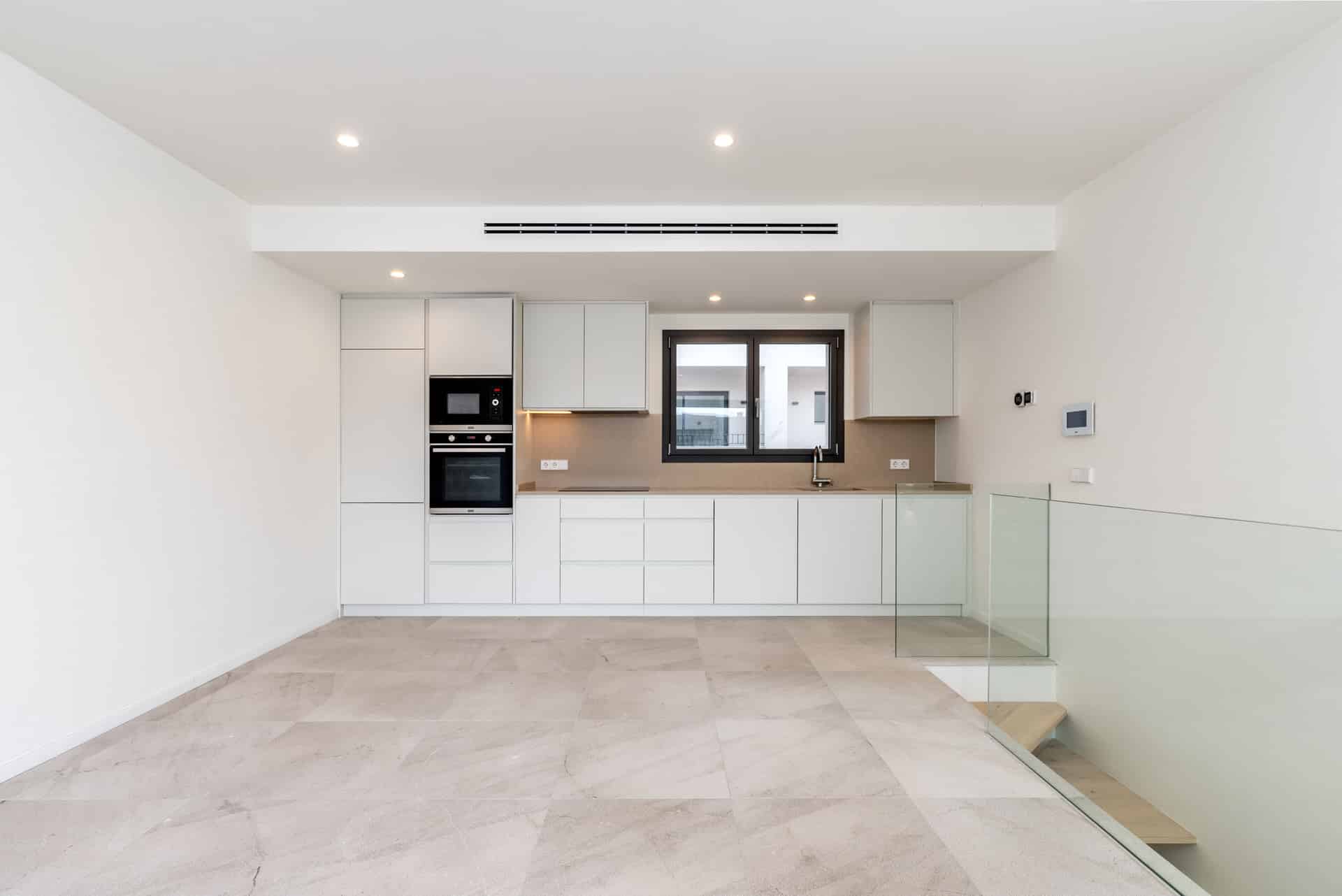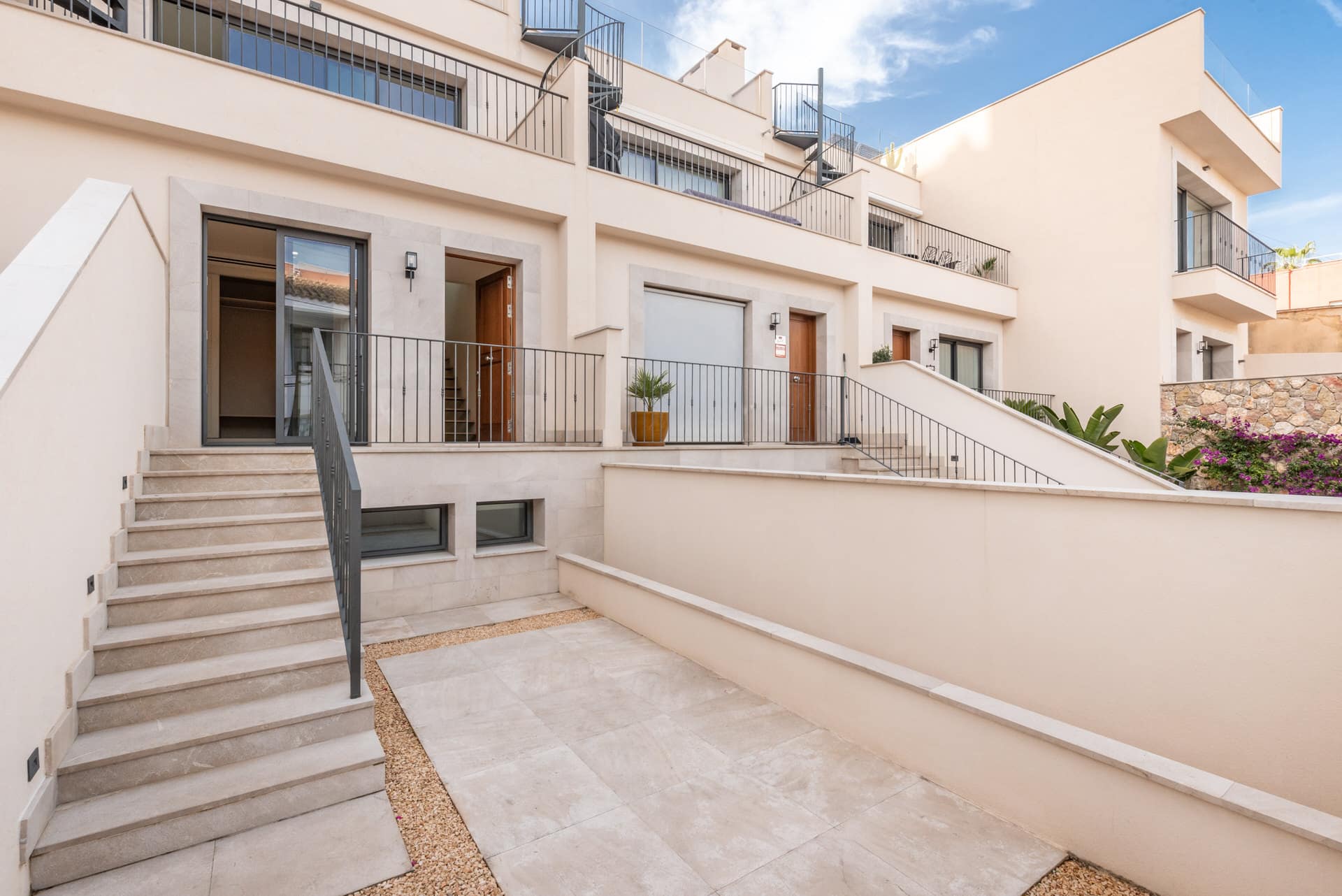 Die Häuser erstrecken sich über drei Etagen und verfügen über großzügige Terrassenflächen, darunter eine mediterran gestaltete Terrasse, eine Dachterrassen-Lounge mit einem Jacuzzi und einen unvergleichlichen Ausblick auf die Bucht von Palma. Diese Oase sorgt für eine ruhige und entspannende Atmosphäre mitten im Stadtgeschehen. Das Design kombiniert moderne Architektur mit typisch mediterranem Charme, was dem Projekt eine elegante Note verleiht.