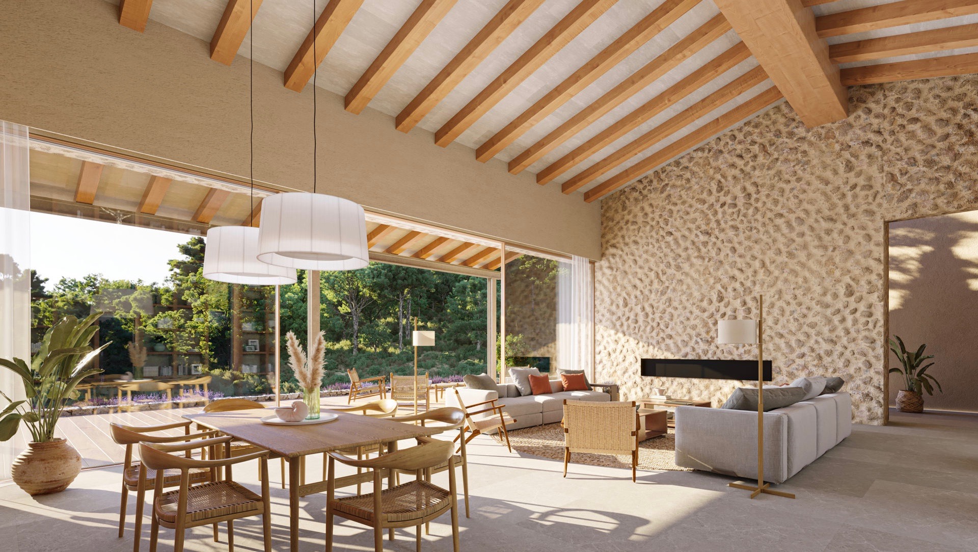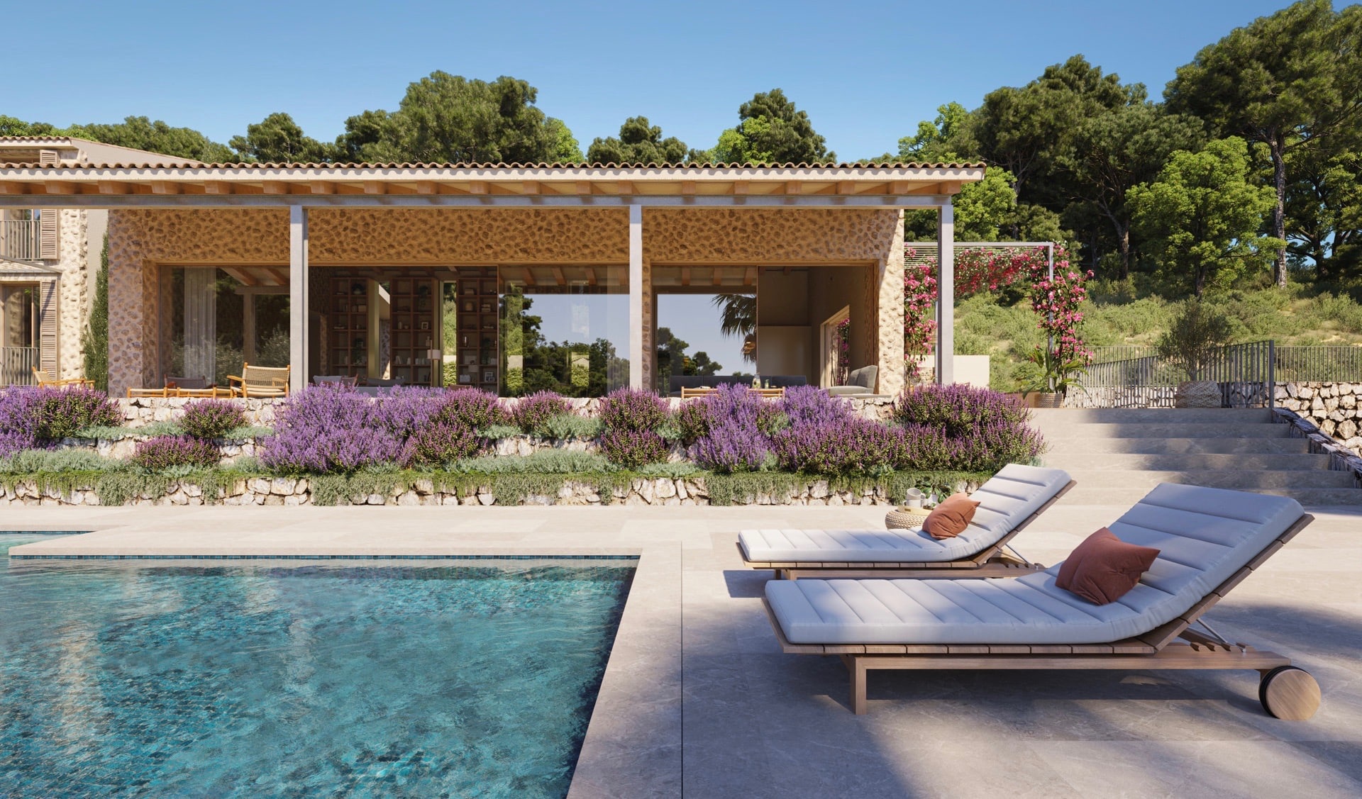 Das Anwesen wird im Erdgeschoss über einen großzügigen Wohnbereich mit Kamin, verschiedene Essbereiche, eine hochwertige Küche, ein Schlafzimmer, ein Badezimmer, ein Ankleidezimmer mit Einbauschränken und ein Gäste-WC verfügen. Im ersten Stock werden sich drei Schlafzimmer und drei Badezimmer befinden. Im Untergeschoss werden Sie einen Fitnessraum, eine Sauna, ein Badezimmer, eine Gästetoilette, einen Maschinenraum, einen Waschraum und einen Abstellraum vorfinden. Der Außenbereich dieser Immobilie wird einen Essbereich im Freien mit Grill, einen Pool und große Gartenflächen bieten. Eine Garage für vier Fahrzeuge und zusätzliche Stellplätze sind ebenfalls geplant. Geplantes Bauende: 2025.