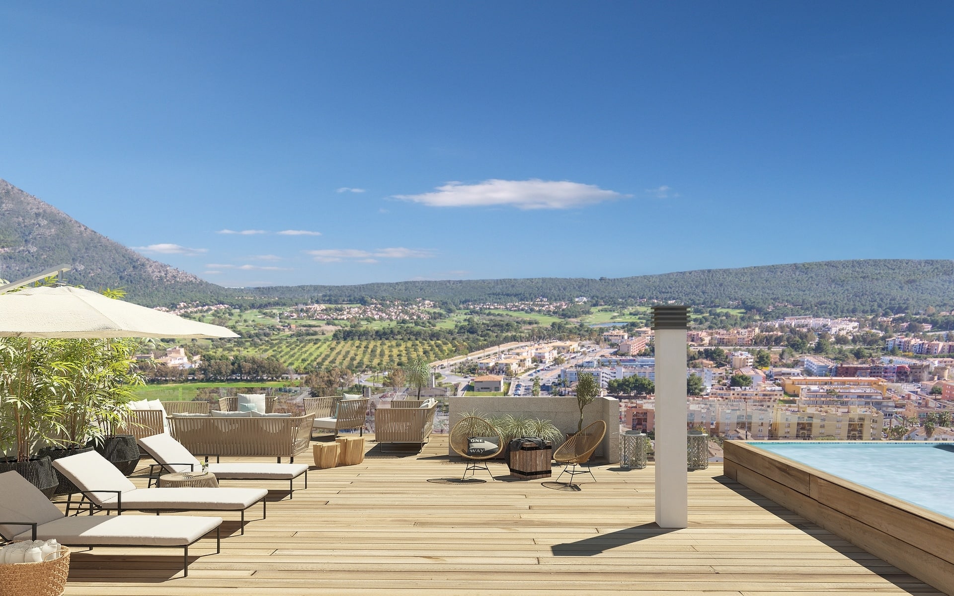 Ausstattung: Große Terrasse, Gemeinschaftspool, Tiefgaragen-Stellplatz, Klimaanlage, Fußbodenheizung, Aufzug im Gebäude, hochwertige Baumaterialien und handwerkliche Verarbeitung mit guter Energieeffizienz