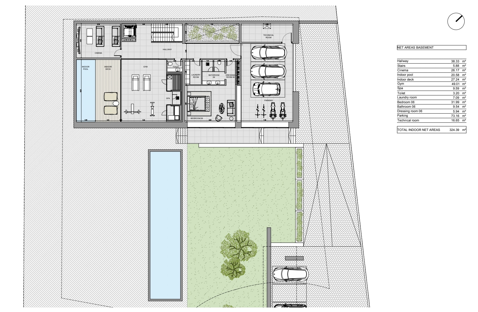 Das Untergeschoss wird zu Ihrer persönlichen Wellness-Oase. Hier finden Sie ein weiteres Schlafzimmer mit Bad en suite und Ankleidezimmer, ein Gäste-WC, einen Kinoraum, einen Indoorpool, einen Fitnessraum, einen Wellnessbereich, eine Waschküche, einen Technikraum und eine Garage für bis zu drei Fahrzeuge.