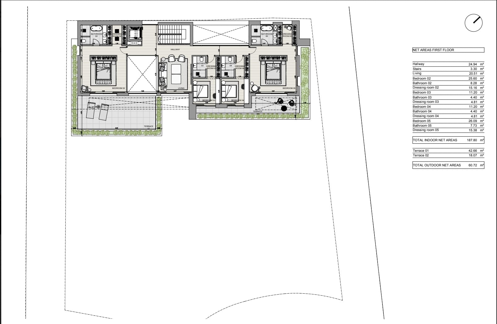 Im Obergeschoss erwarten Sie vier luxuriöse Schlafzimmer, die jeweils mit einem eigenen Bad und einem Ankleidezimmer ausgestattet sind. Ein zusätzlicher Wohnbereich bietet Ihnen Raum für Entspannung und Privatsphäre.