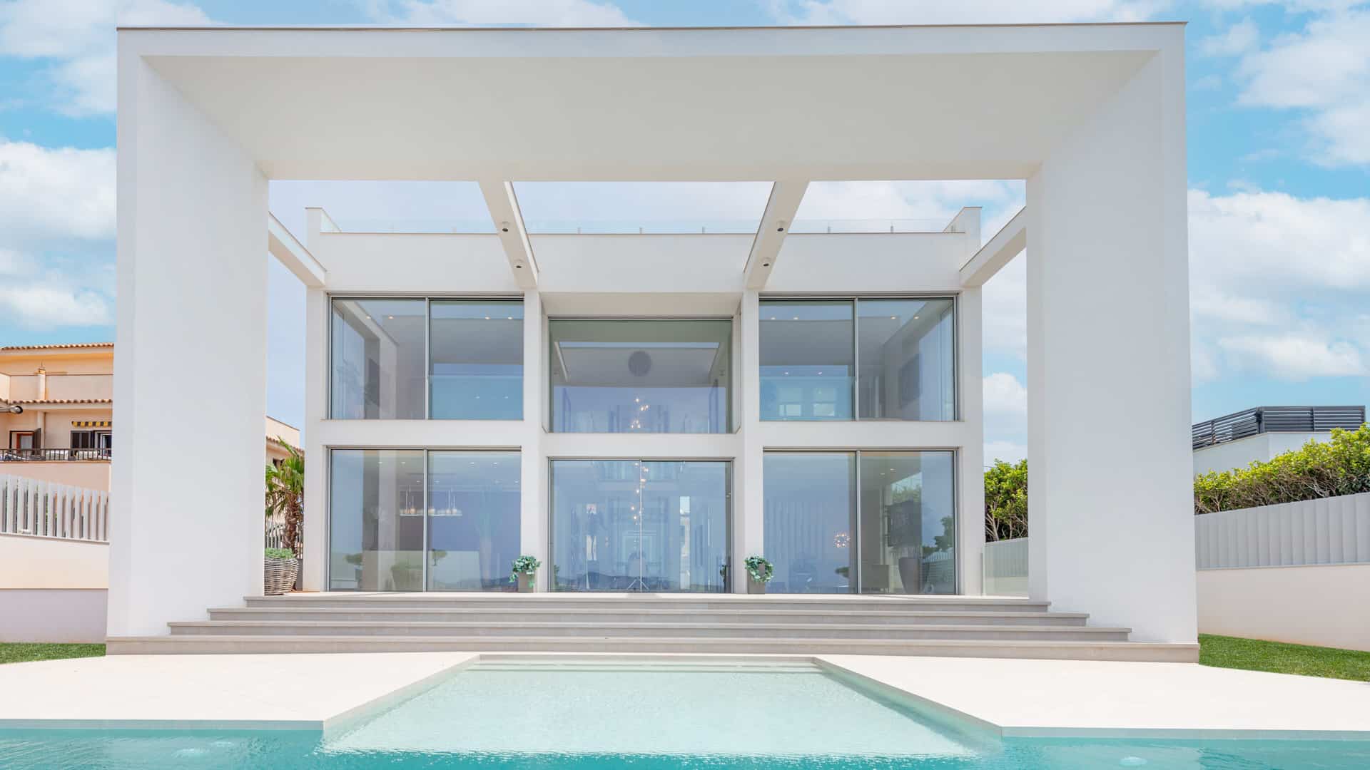 Die spektakuläre Meerblick-Villa erstreckt sich über insgesamt 615 m² und besticht durch eine innovative Raumaufteilung. Im Erdgeschoss, dem Eingangsbereich, befindet sich ein gläserner Designer-Aufzug, der elegant alle drei Ebenen der Immobilie miteinander verbindet.