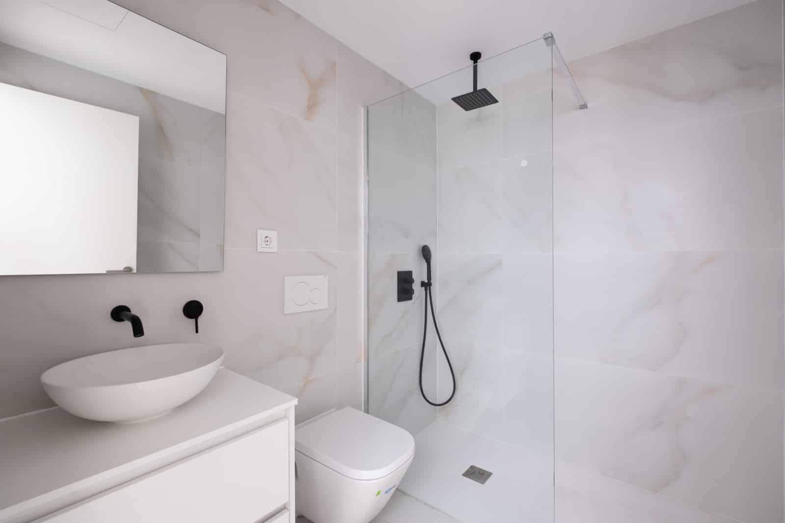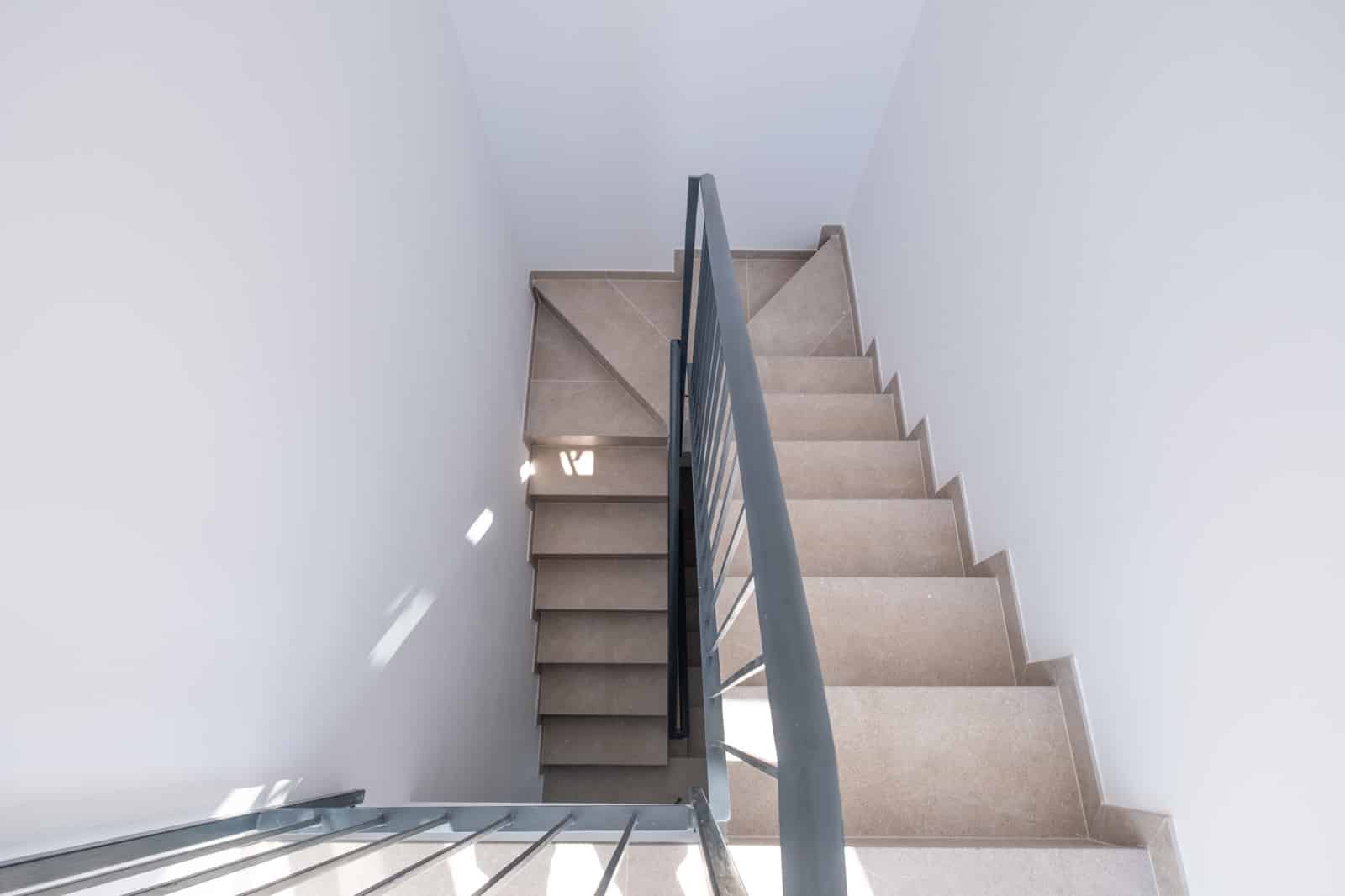 Im Innenbereich erwarten Sie großformatige Natursteinböden (Caliza Sinai), glatte Decken, sowie weiß lackierte Innentüren mit stilvollen Beschlägen. Die Wohnräume sind offen gestaltet und werden durch eine energieeffiziente Fußbodenheizung sowie Split-Klimaanlagen in allen Zimmern angenehm temperiert – Sommer wie Winter.