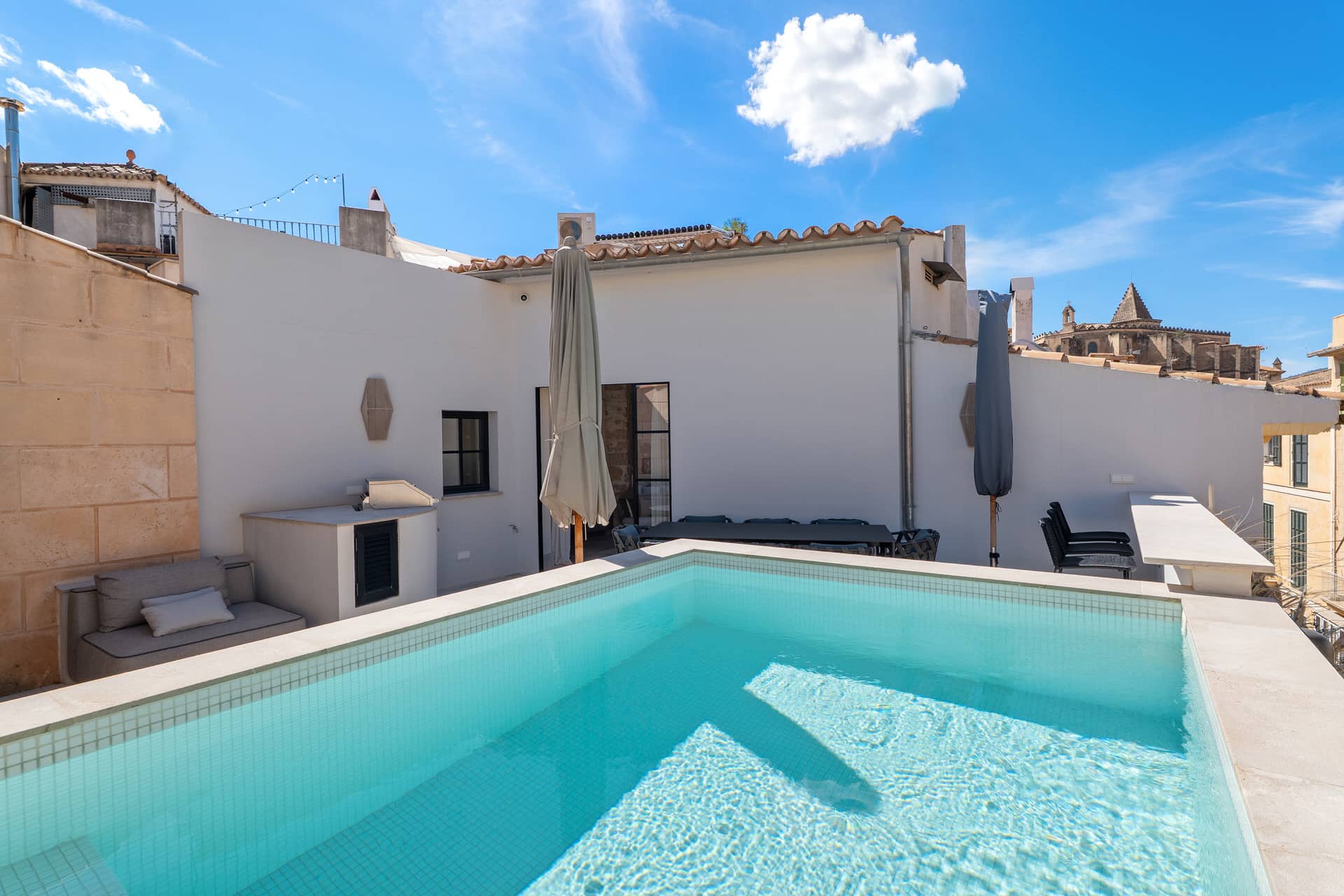 Eine Etage darüber befindet sich die Dachterrasse mit Pool. Für entspannte Stunden gibt es hier neben einem BBQ-Bereich auch eine kleine Küche.