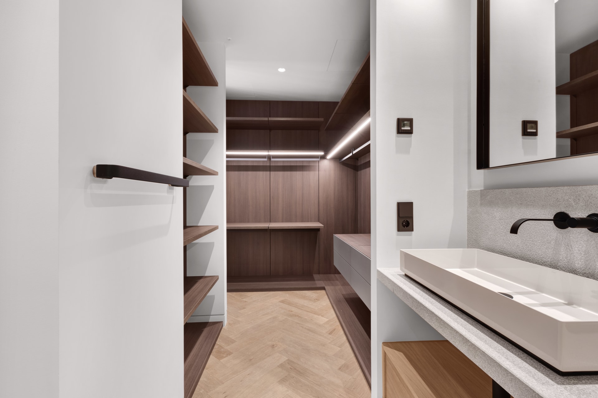 Unterhalb der Dachterrasse befindet sich die geräumige Gästesuite mit Bad und einem begehbaren Kleiderschrank. Die Suite bietet auch eine kleine Lounge mit Sofa und Make-Up Bereich für die Damen. Aber auch der elegante, begehbare Kleiderschrank (Made in Italy) dürfte begeistern. Ein weiteres Gästezimmer mit Bad en-suite befindet sich ebenfalls auf dieser Etage.