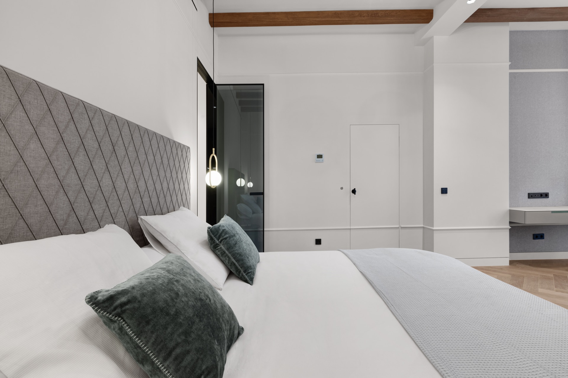 Das Hauptschlafzimmer mit eigener Lounge befindet sich im 1. OG und hat direkten Zugang zum Aufzug, der alle Ebenen der Immobilie verbindet.