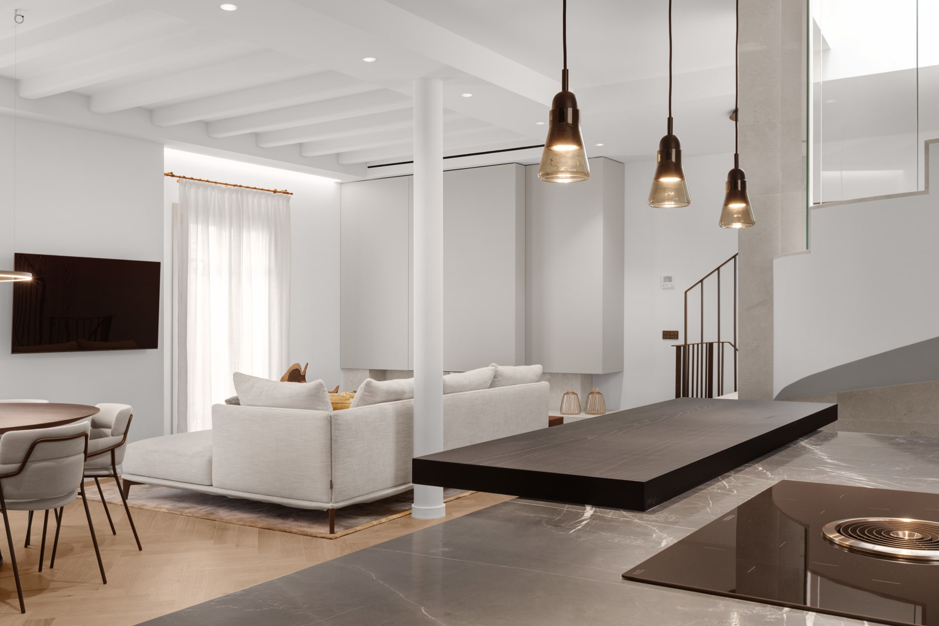 Das Stadthaus verteilt sich auf vier Etagen zzgl. Dachterrasse. Im Erdgeschoss befindet sich die Garage sowie der stylische, in Holz verkleidete Eingangsbereich. Von hier gelangen Sie entweder über das elegante und originalgetreue Treppenhaus oder per Lift in den Wohnbereich im 2. OG, der mit hohen Decken ein eindrucksvolles Ambiente schafft.