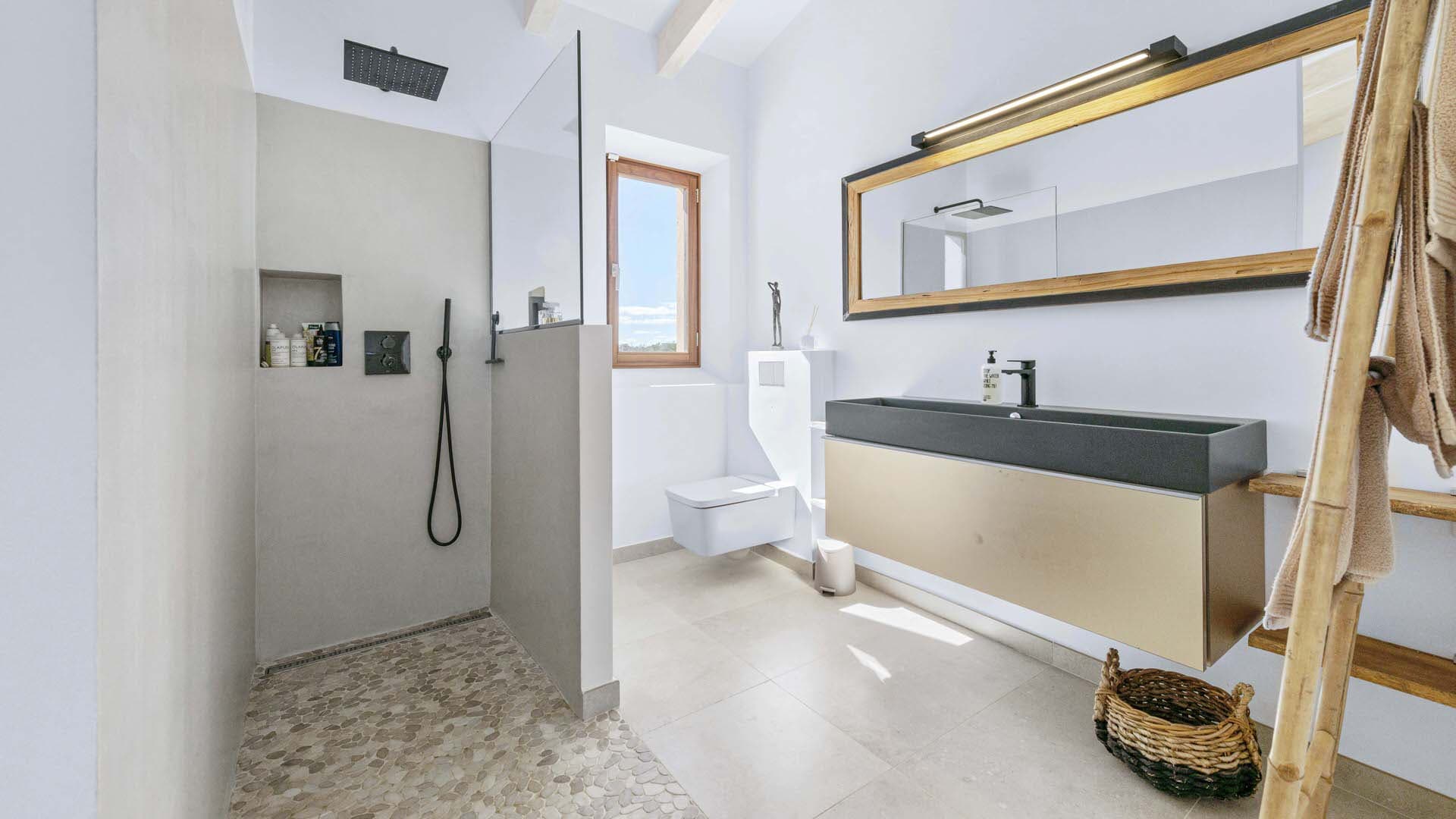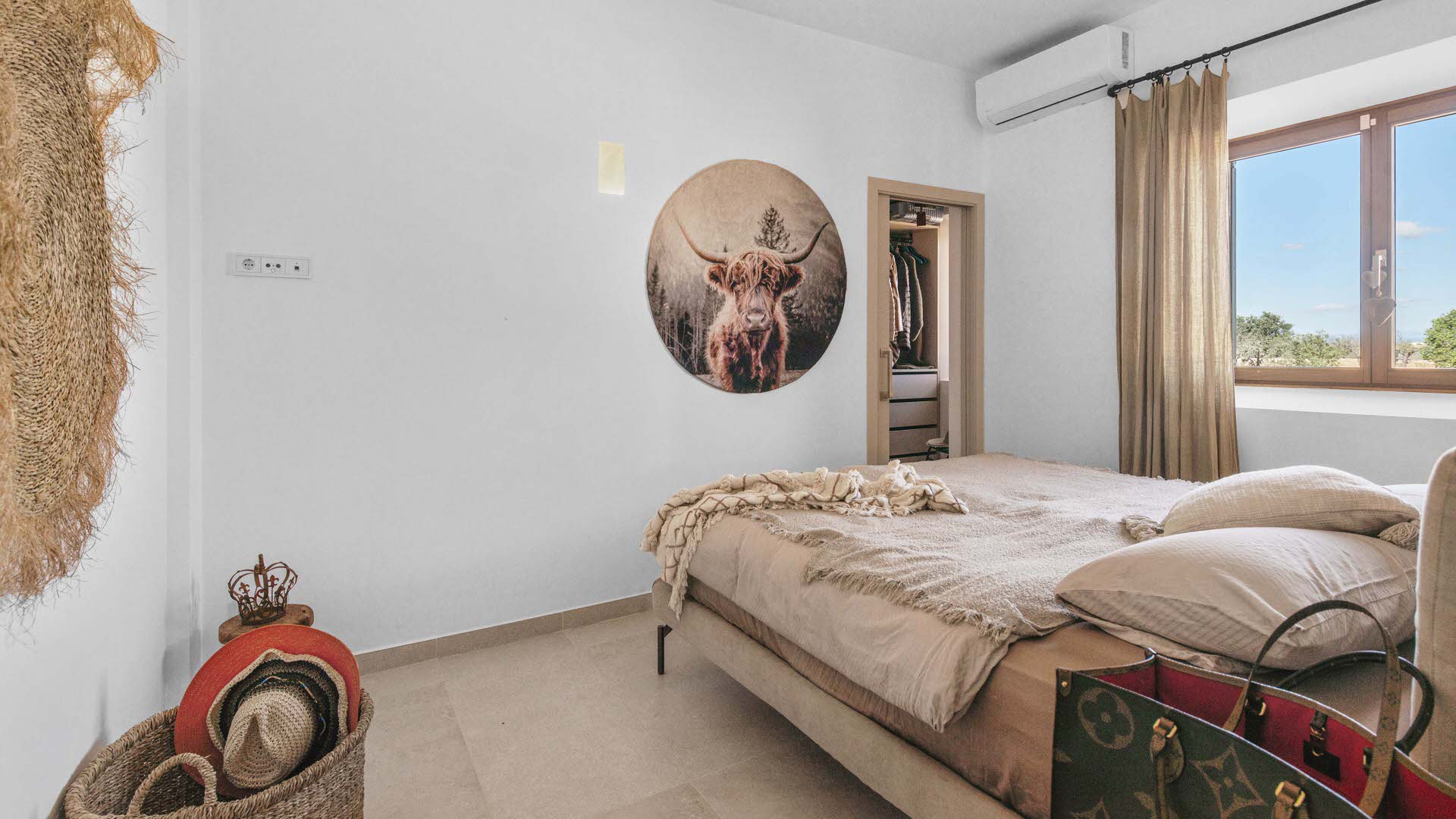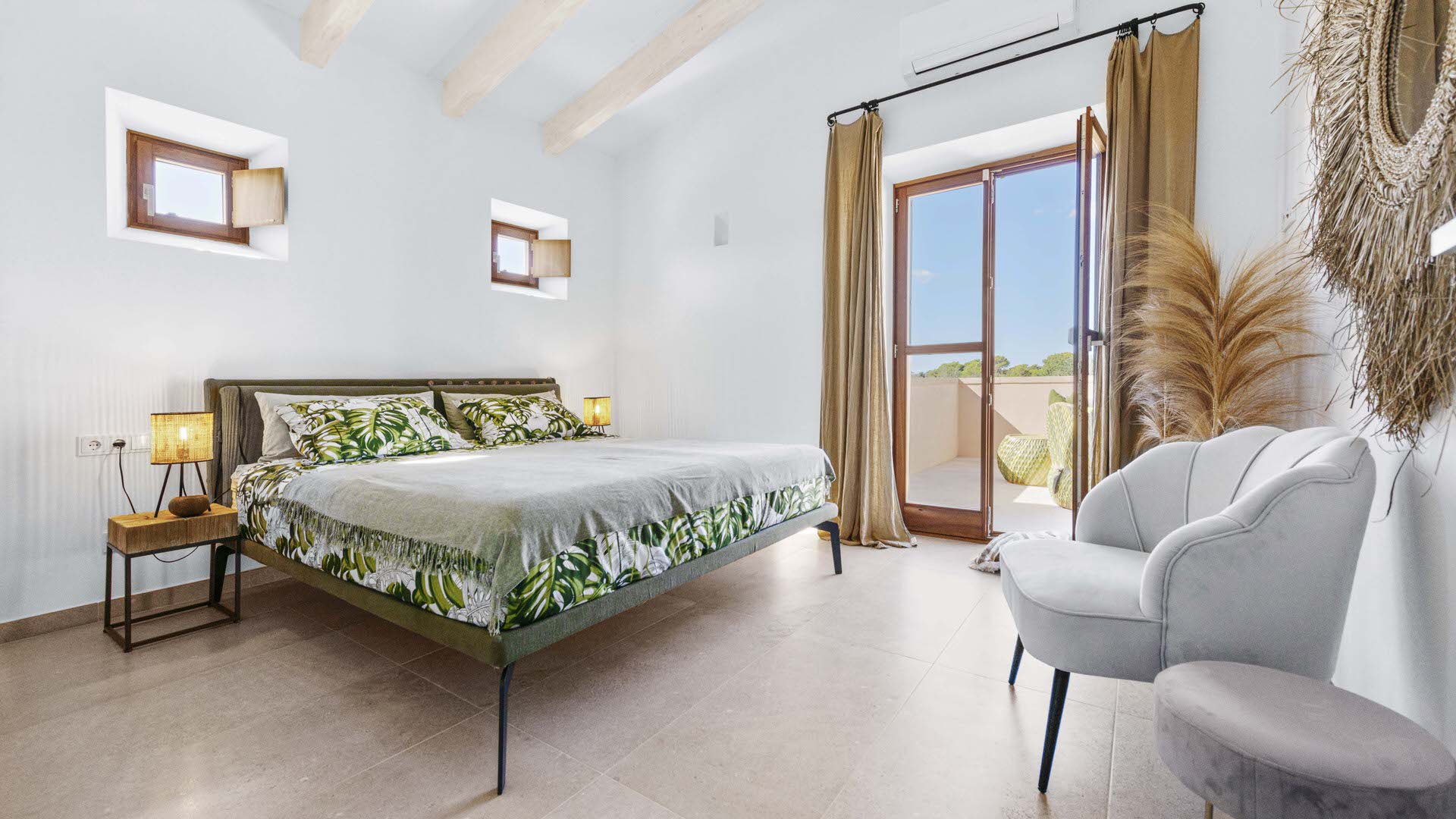 Im Obergeschoss finden Sie zwei weitere Schlafzimmer, die sich ein Badezimmer teilen, sowie das luxuriöse Hauptschlafzimmer mit Bad en suite und Ankleideraum. Dieses Schlafzimmer bietet zudem Zugang zu einer Terrasse mit einem unbeschreiblich schönen Blick auf Ses Salines und das beeindruckende Tramuntana-Gebirge.