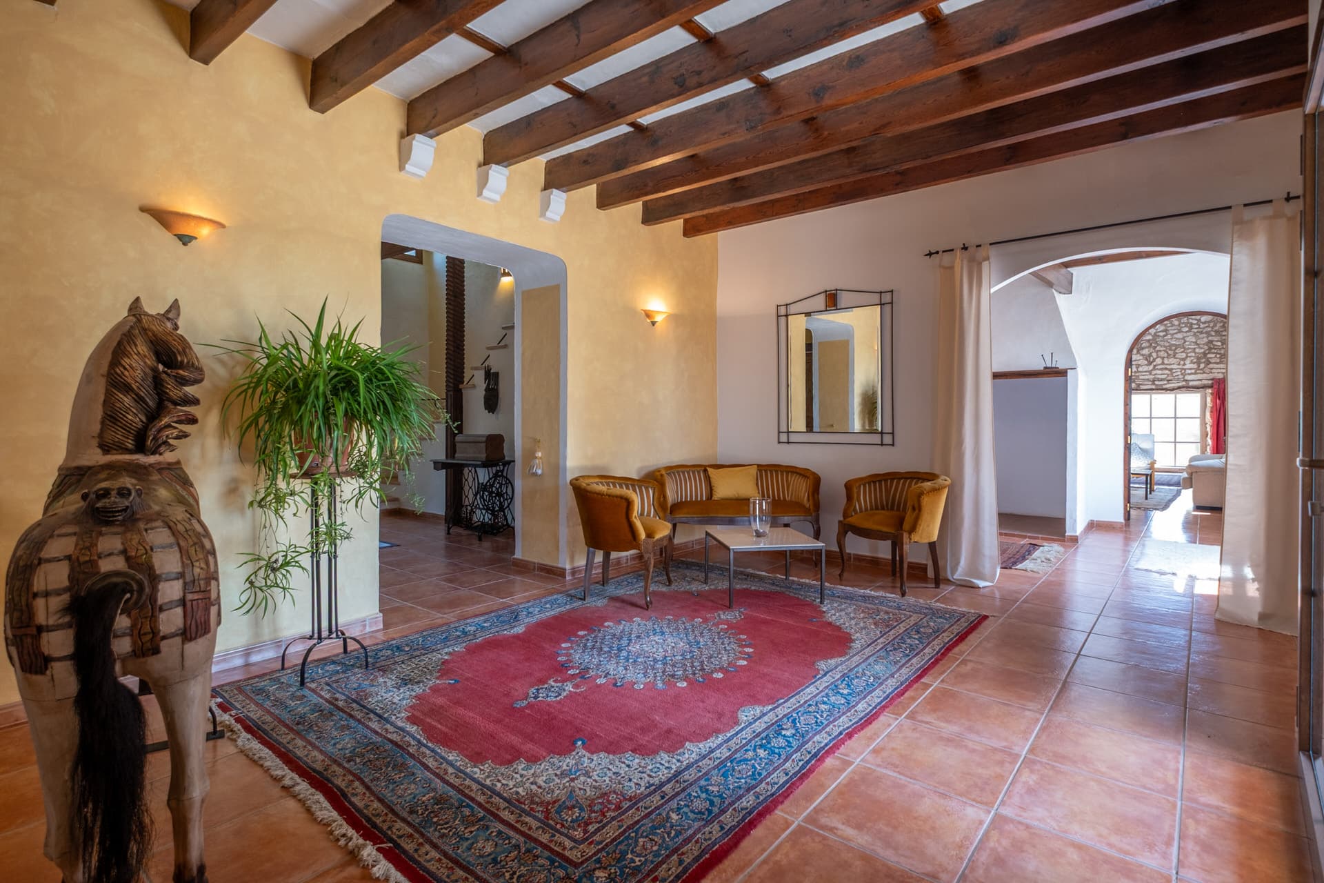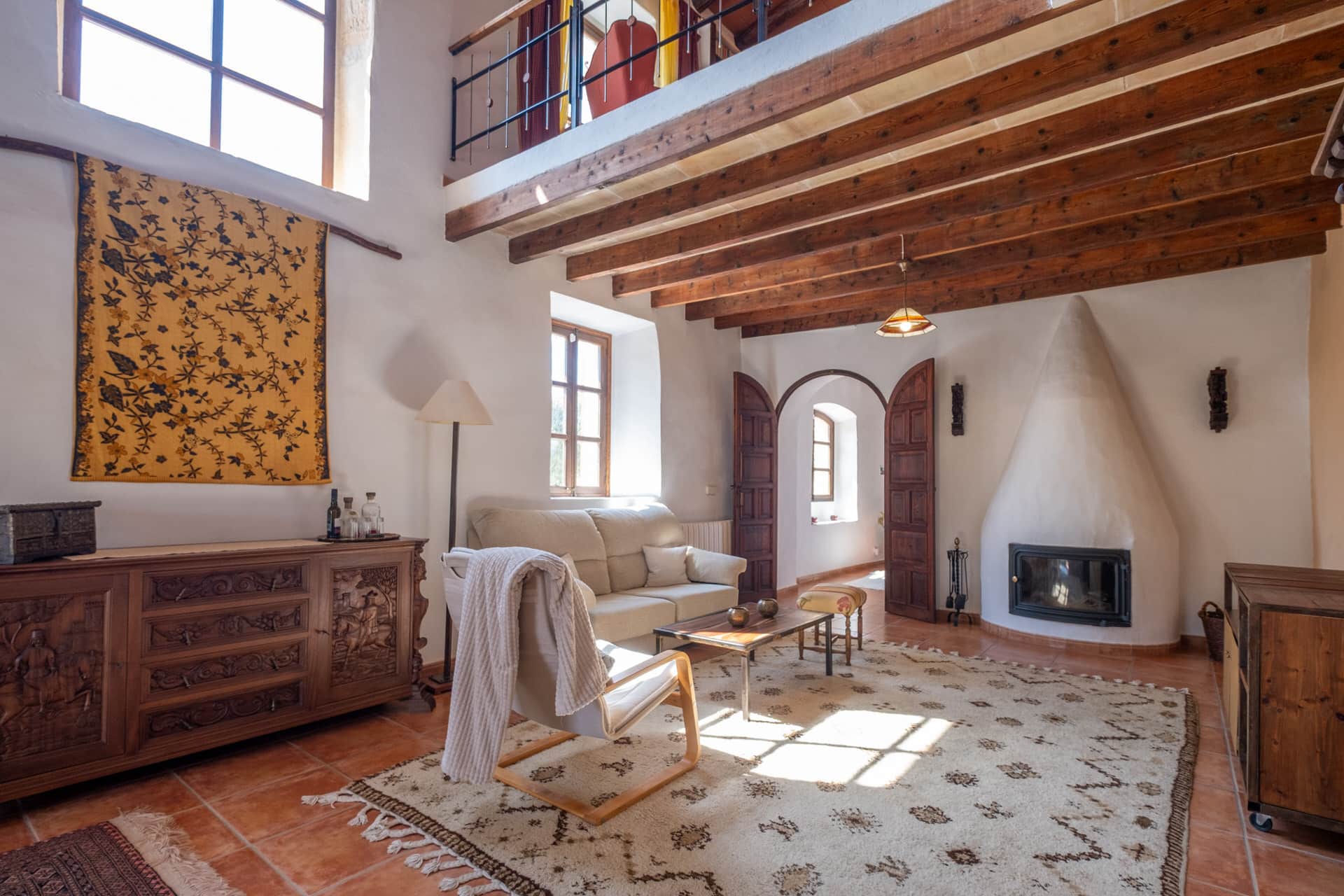 – Hohe Decken mit dekorativen Holzbalken schaffen ein besonderes Raumgefühl.