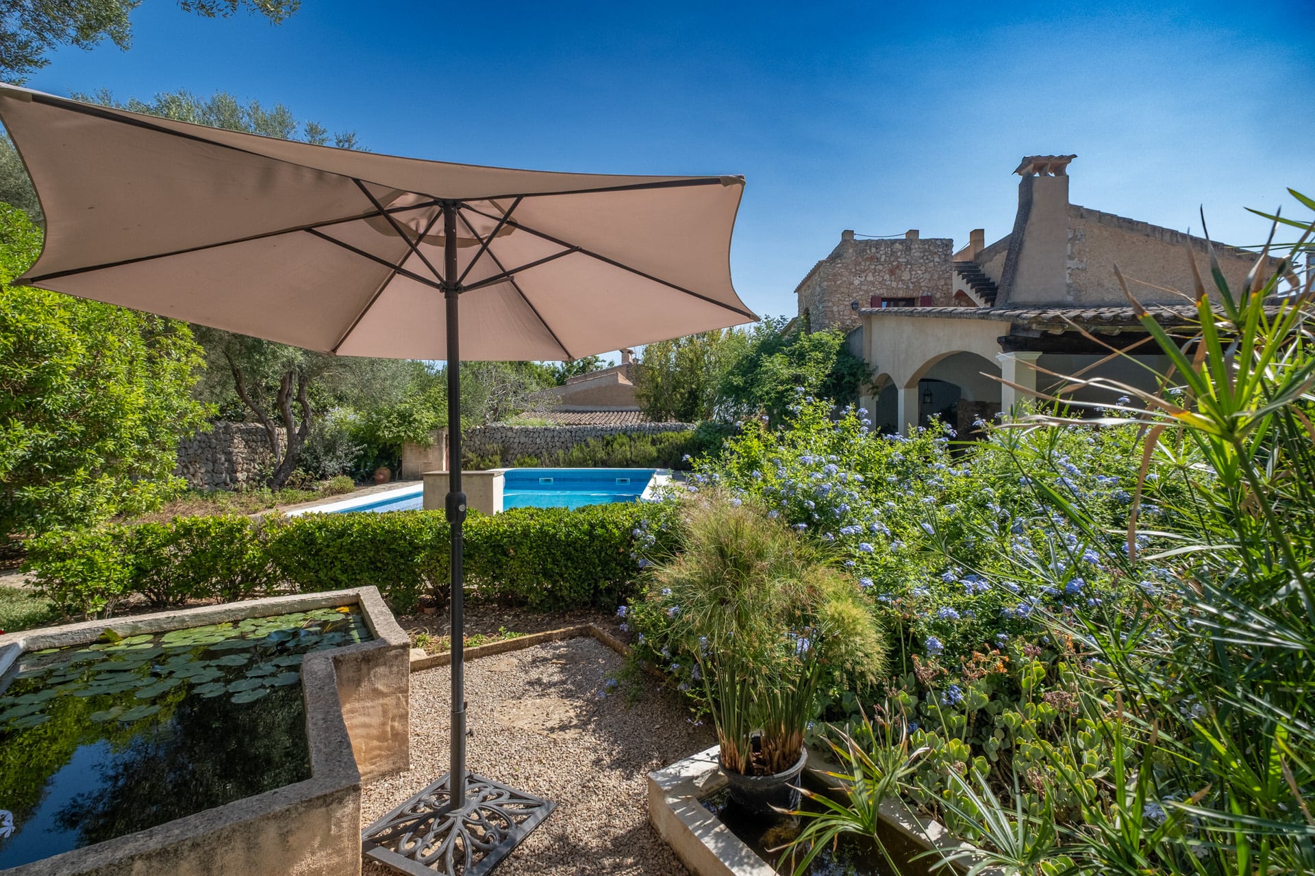 Hinter dem Haupthaus befindet sich auch ein kleiner Hühnerstall, ein Zitrushein, ein kleiner hübsch angelegte Teich, Blumen und Gemüsebeete und ein weiteres 140 Quadratmer großes Gebäude, die ehemalige Scheune, die beispielsweise zu einem eigenständigen Gästehaus oder Ateleir umgebaut werden könnte.