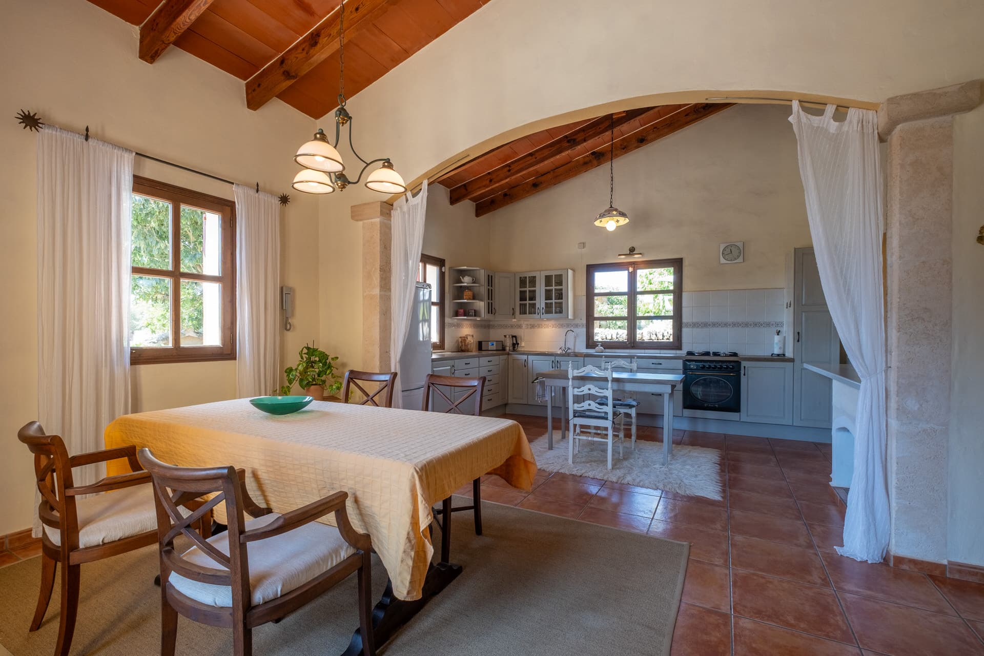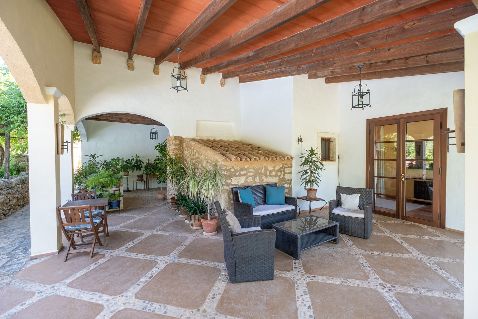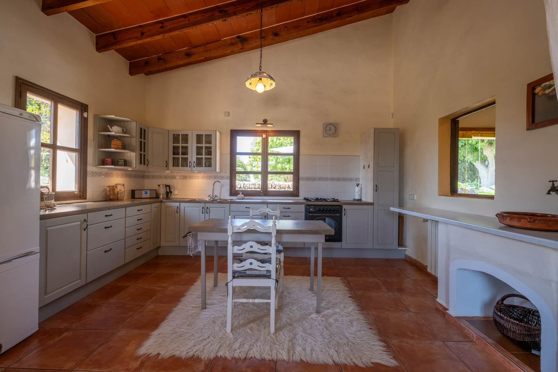 Im weiteren Trakt des Gebäudes, der sich auch von außen optisch durch die rustikalen Steinwände abhebt, befindet sich eine offene Küche mit zusätlichem Essbereich. Von hier aus gelangt man auf die umliegenden Terrasse, dem BBQ Bereich mit altem malloquinischen Pizzaofen und dem Poolbereich, der mit einem großen Salzwasserpool aufwartet.