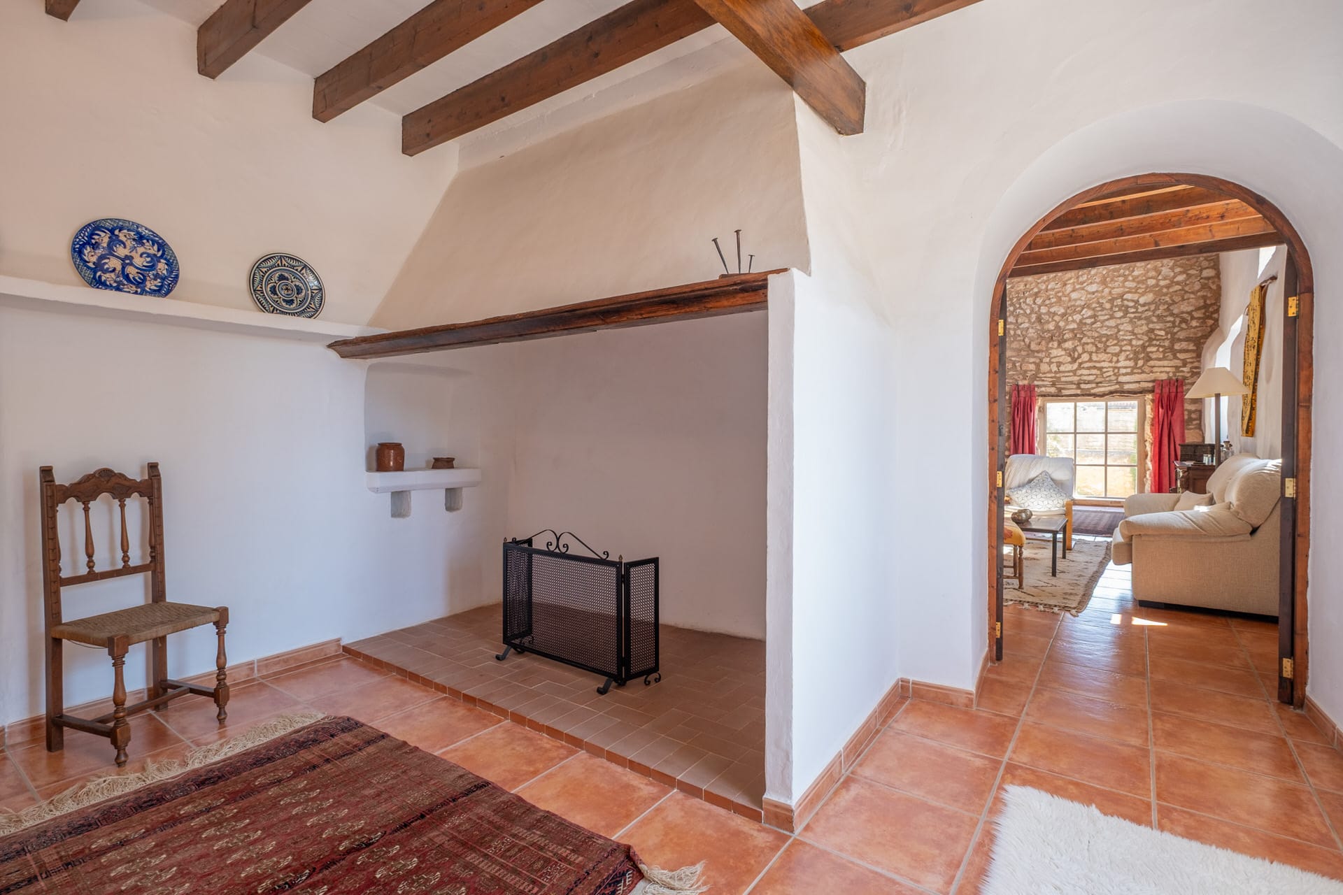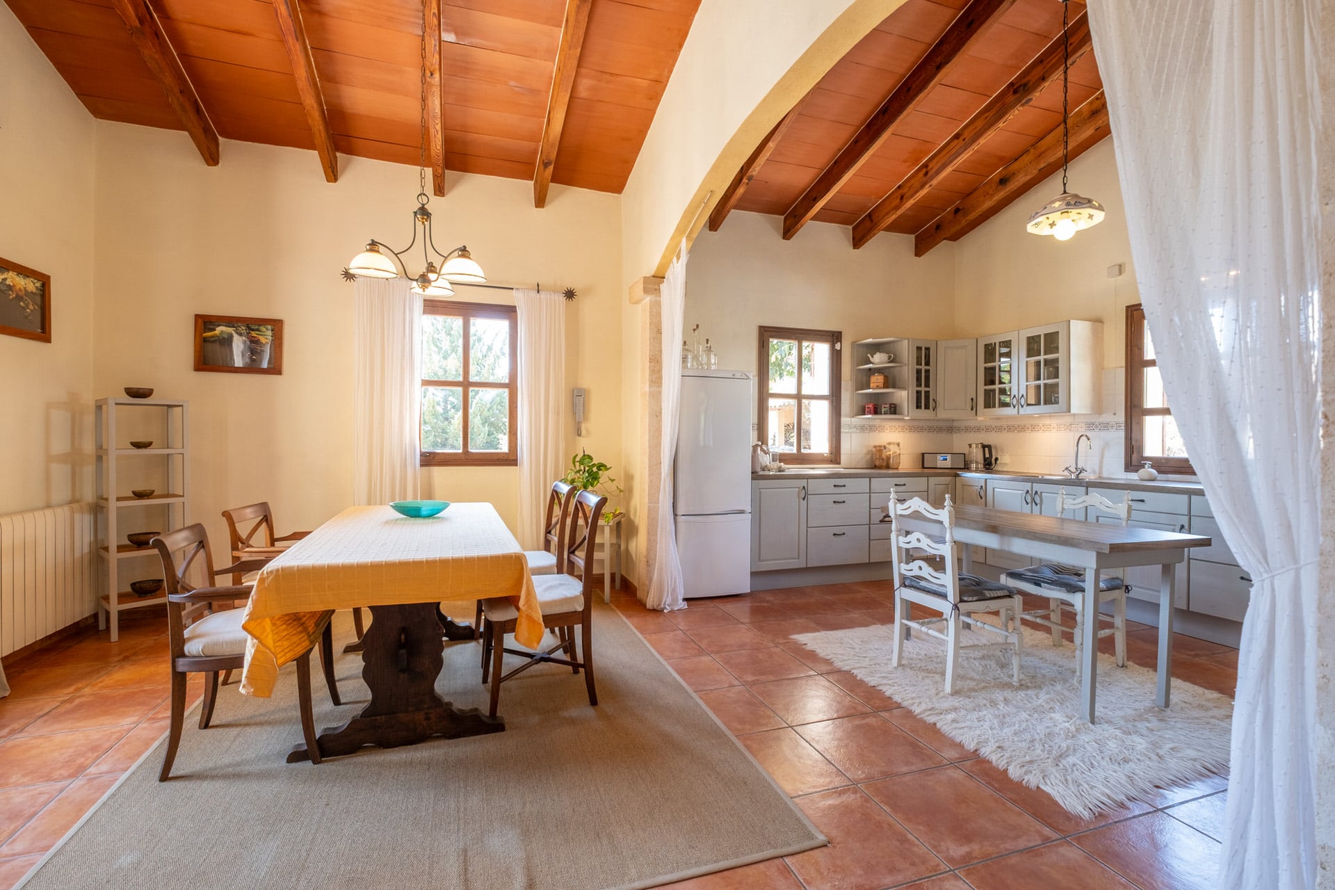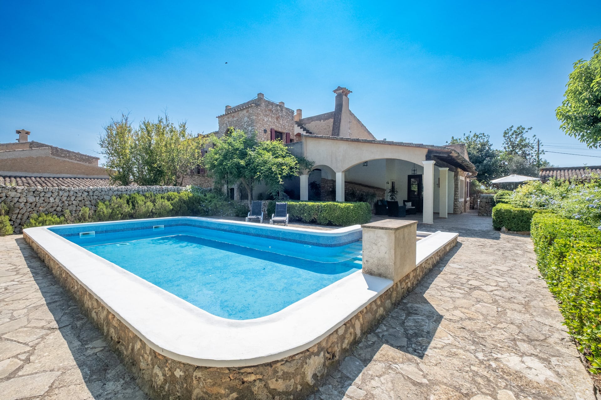 Im weiteren Trakt des Gebäudes, der sich auch von außen optisch durch die rustikalen Steinwände abhebt, befindet sich eine offene Küche mit zusätlichem Essbereich. Von hier aus gelangt man auf die umliegenden Terrasse, dem BBQ Bereich mit altem malloquinischen Pizzaofen und dem Poolbereich, der mit einem großen Salzwasserpool aufwartet.