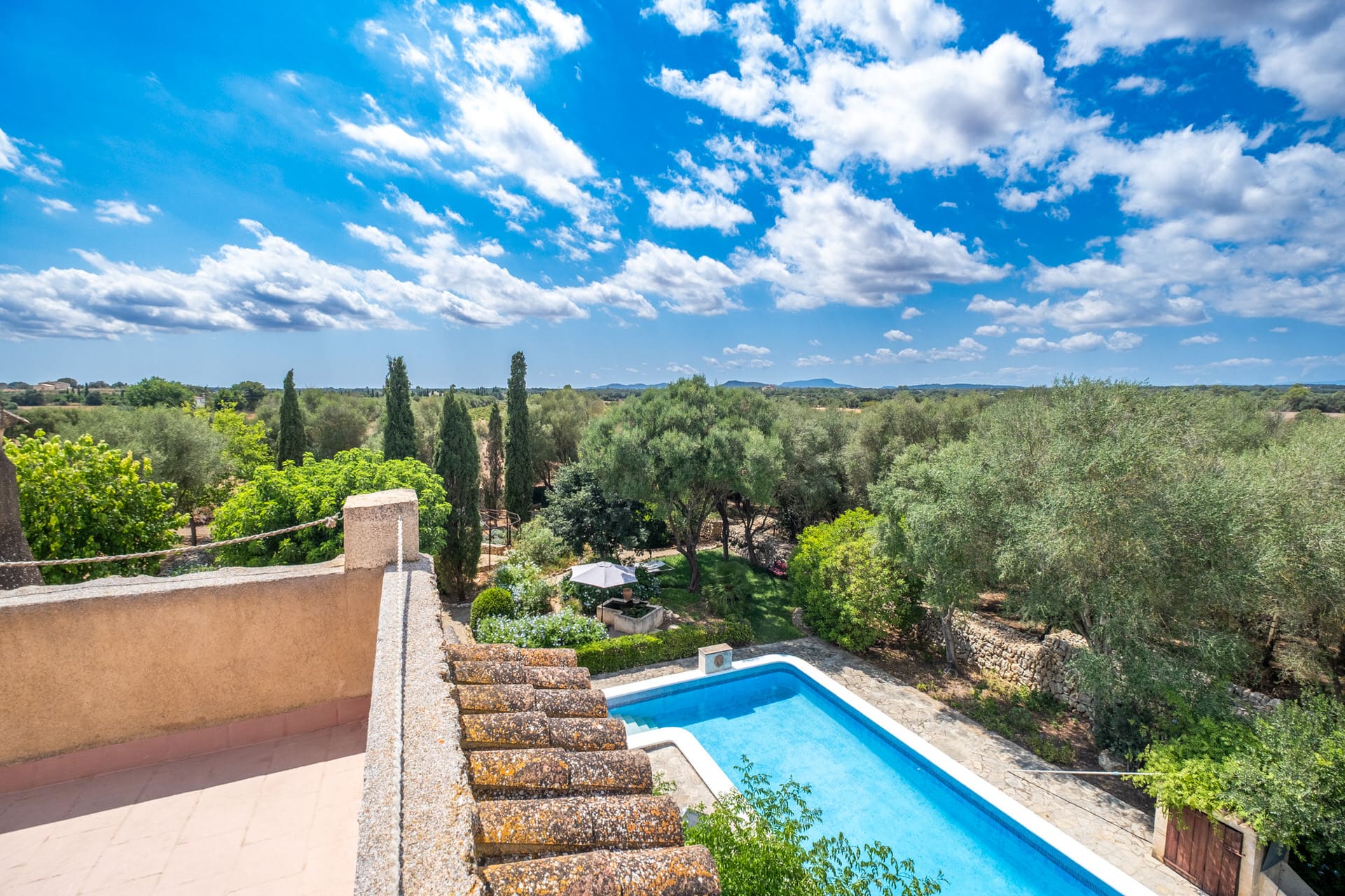 Ein ganz besonderes Highlight ist der Panoramablick von der oberen Dachterrasse. Von hier aus genießt man einen spektakulären Ausblick auf das mallorquinische Hinterland.