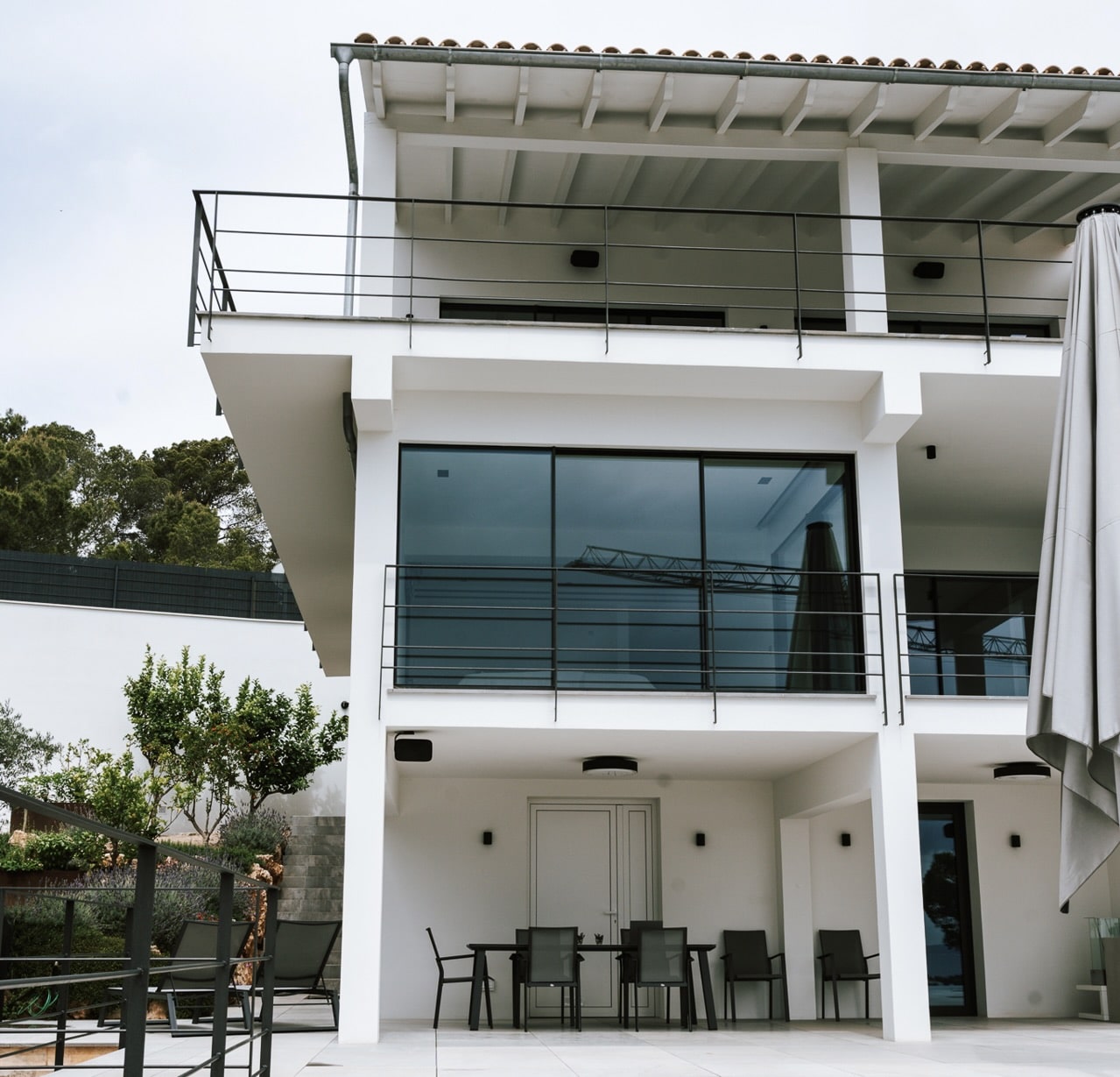 Vom Eingangstor gelangt man in den Innenhof von wo aus man die den geräumigen und gemütlichen Wohn-/Essbereich mit Kamin betritt. Im Anschluss daran befindet sich die offene voll ausgestattete high end Küche, ein Büro, ein Gäste-WC und eine Speisekammer. Von hier aus hat man Zugang zur teilweise überdachten Terrasse mit einem 84 m² großen Infinity Pool und herrlichem Blick auf das Tal wie auch auf das Meer. Insgesamt bietet diese Immobilie drei Schlafzimmer, alle mit Bädern en suite. Eines der Schlafzimmer befindet sich in einem Gäste-Apartment mit eigenem Eingang und Ankleidezimmer. Das Gäste-Apartment ist durch eine Terrasse mit dem Hauptschlafzimmer verbunden. Dieses wiederum verfügt über einen eigenen begehbaren Kleiderschrank und ein Bad en suite. Der Außenbereich ist mit einem Kräutergarten und mediterranen Pflanzen ausgestattet wie auch mit einer weiteren voll ausgestatteten Küche mit zusätzlichem Essbereich (mit TV), ein BBQ-Bereich, ein Gäste-WC und als besonderes Highlight die Dschungel-Dusche. Eine Treppe führt Sie zu einer weiteren Terrasse, die als Chill-out-Bereich gedacht ist.