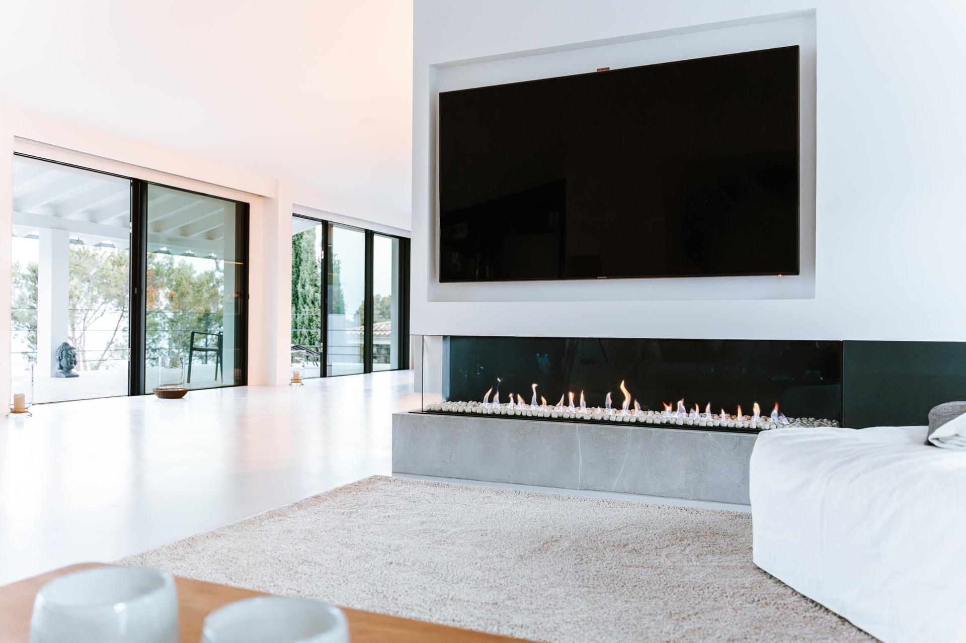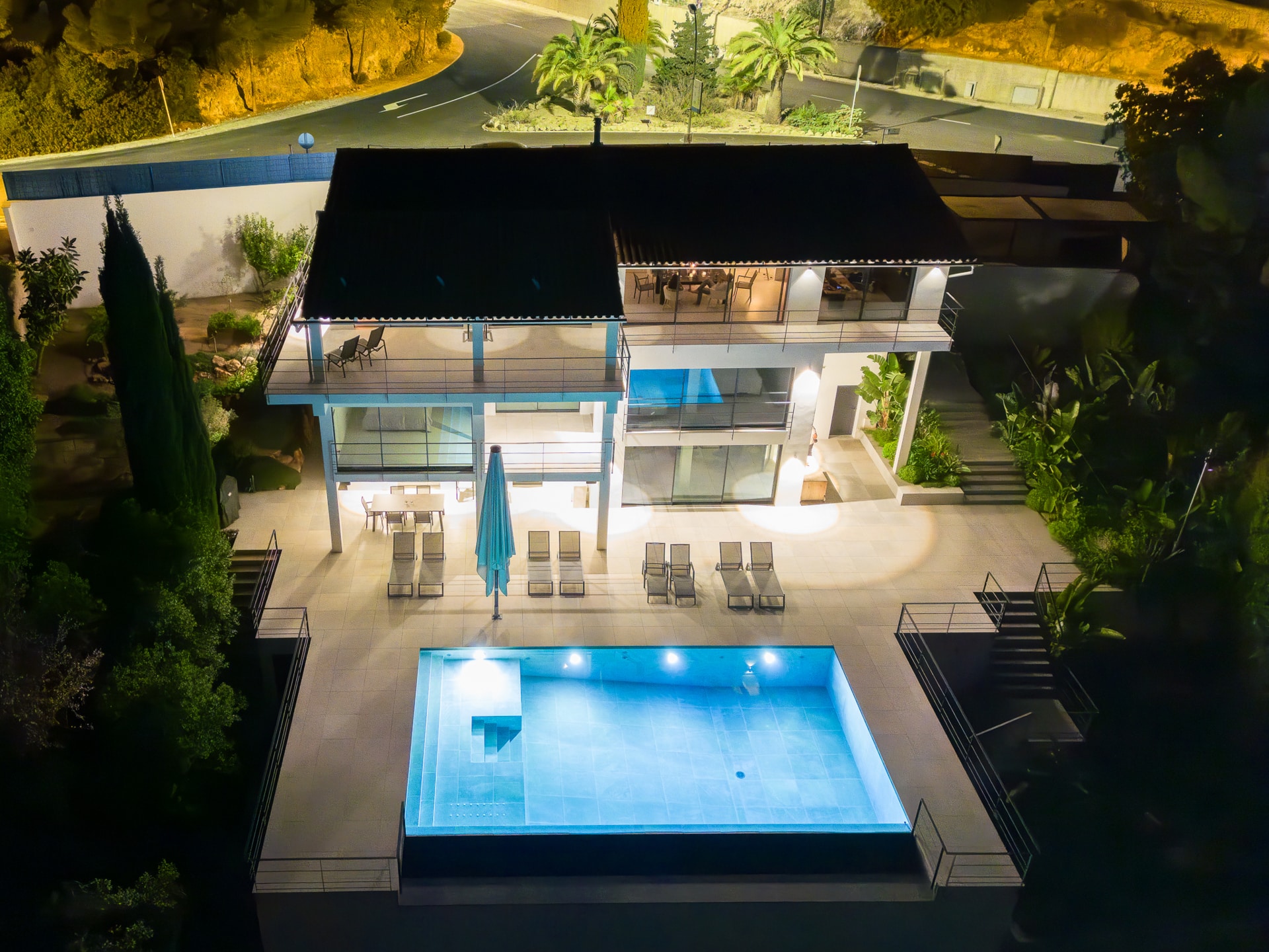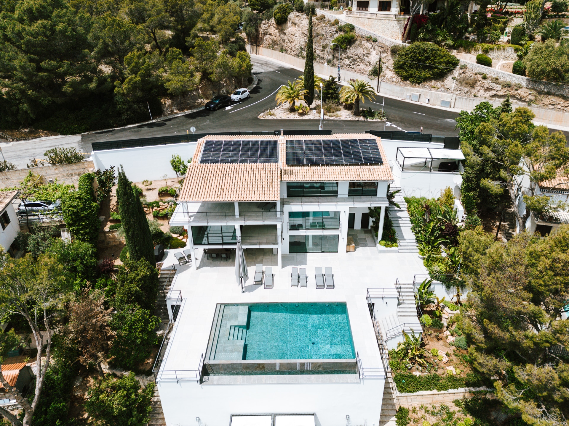 Ausstattung: Fußbodenheizung, Kamin, Klimaanlage, Solar-Anlage, 84 m² großer Infinity Pool, erhöhte Lage dadurch traumhaften Blick über das Tal bis zum Meer, separat begehbares Gäste-Apartment, Garage für 2 Fahrzeuge, Domotik, moderne Technologien & Beleuchtungen, Außenküche mit Grillplatz & TV, Microzement- und Steinböden uvm.