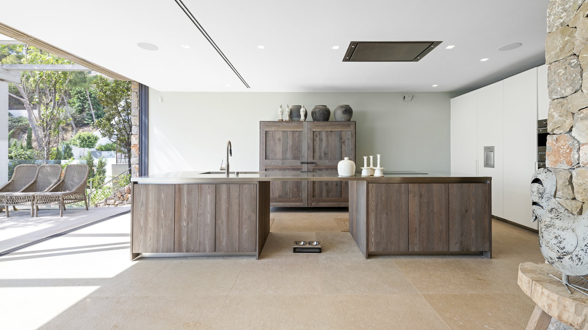 Die Villa hat eine Wohnfläche von ca. 500 m² welche sich über drei Etagen verteilen wie folgt: auf der Hauptebene befindet sich der offene und lichtdurchflutete Wohn-/Essbereich mit Kamin und angrenzender, voll ausgestatteter Küche.
