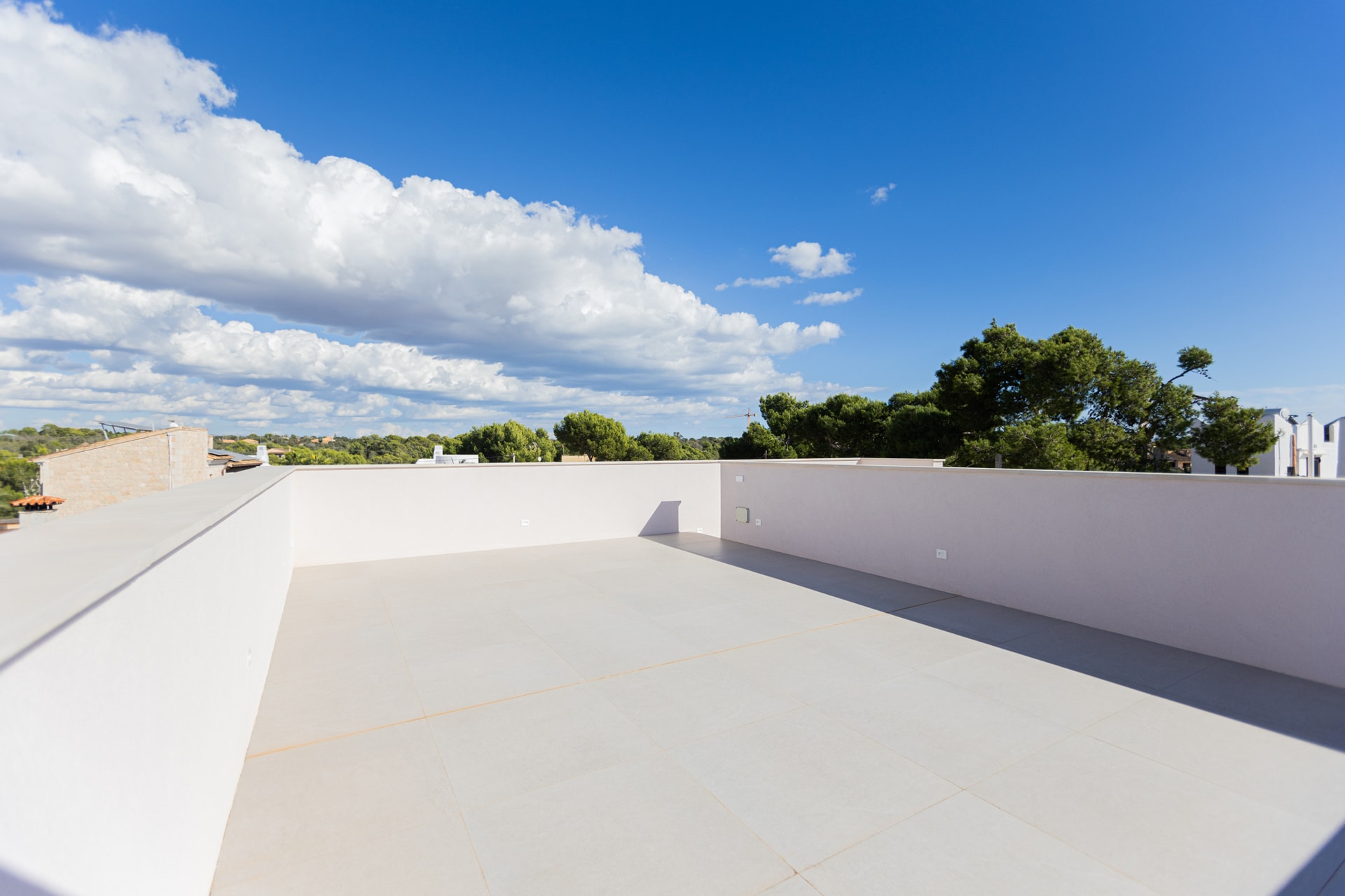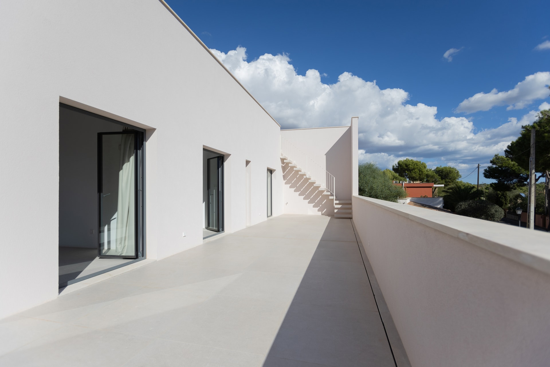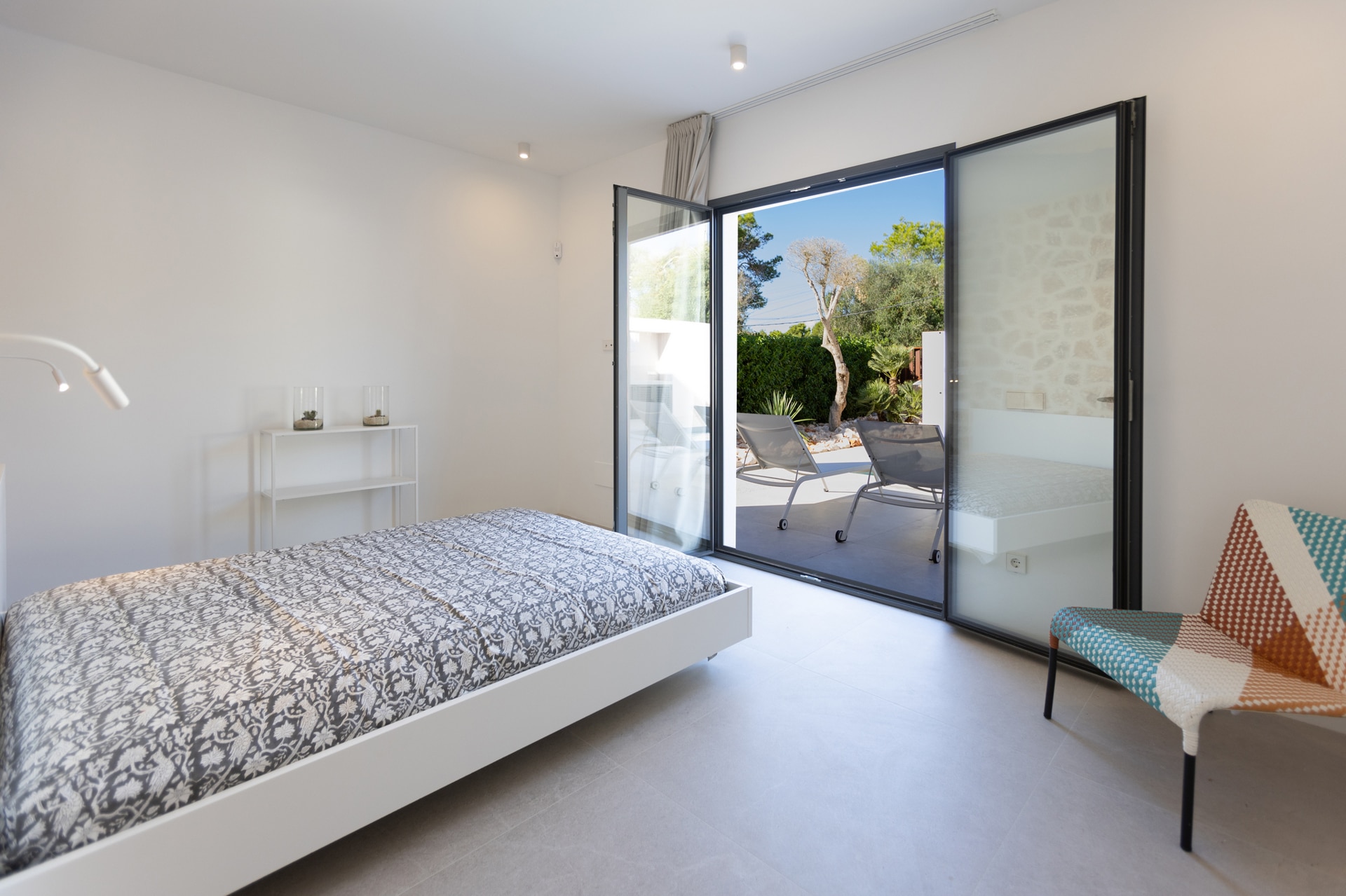 Die erste Etage disponiert zwei Schlafzimmer welche sich ein Badezimmer teilen, sowie eine Suite mit Ankleideraum und Bad en suite. Auch auf dieser Ebene gibt es eine weitläufige Terrasse mit herrlichen Meer- und Bergblick.