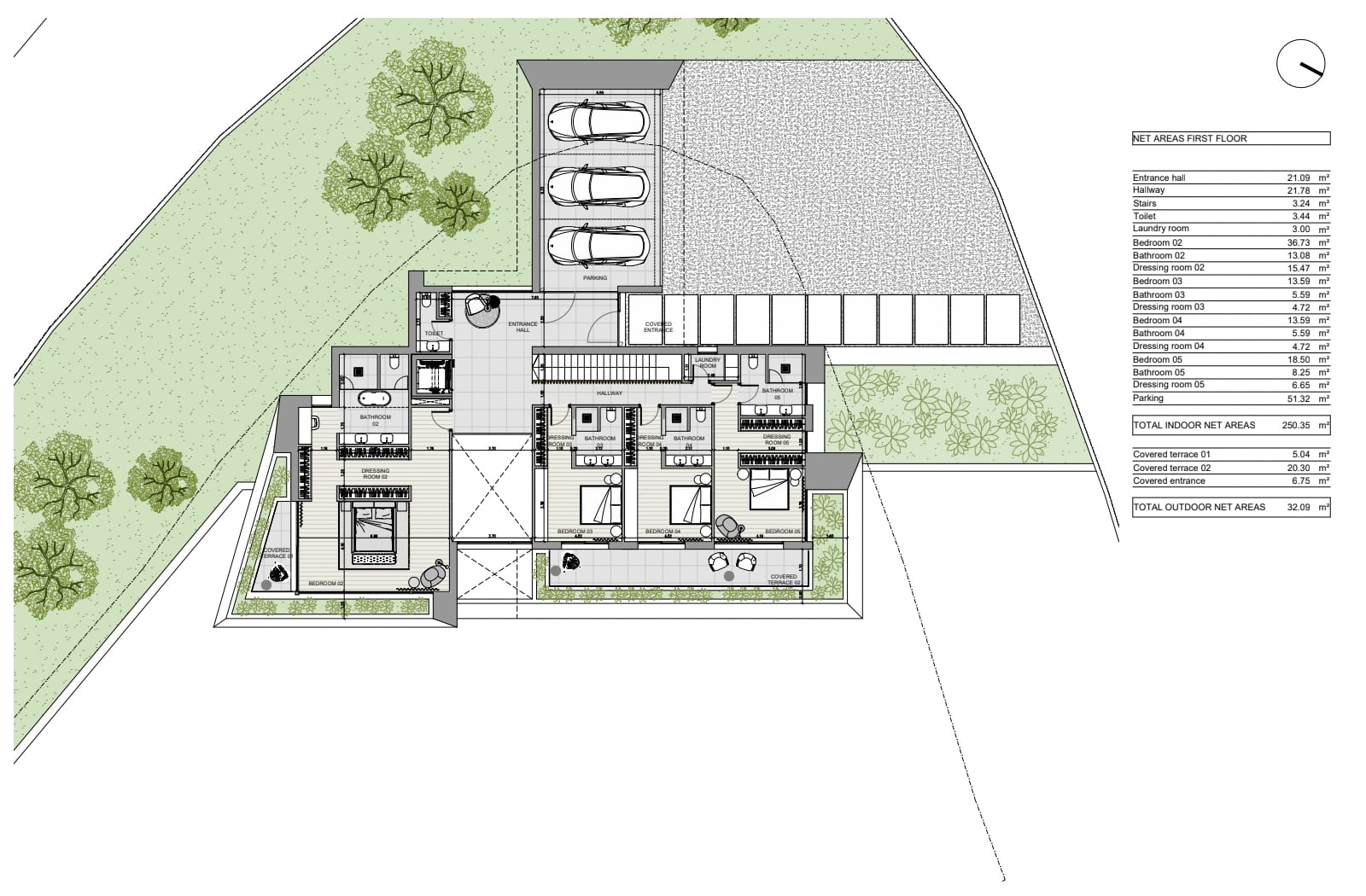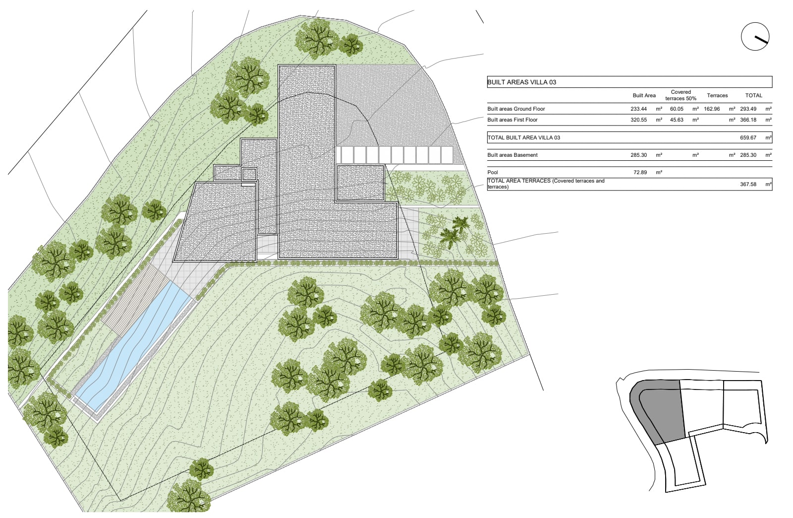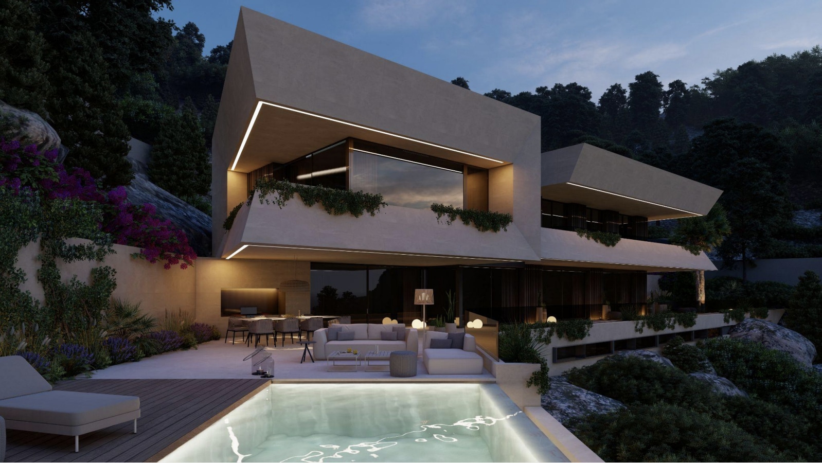 Auf einem ca. 2.960 m² großen Grundstück entsteht eine Villa mit ca. 945 m² Wohnfläche, die auf drei Ebenen ein unvergleichliches Wohnerlebnis bietet. Die exklusive Lage, umgeben von Natur, garantiert absolute Privatsphäre und einen atemberaubenden Panoramablick auf die umliegende Landschaft.