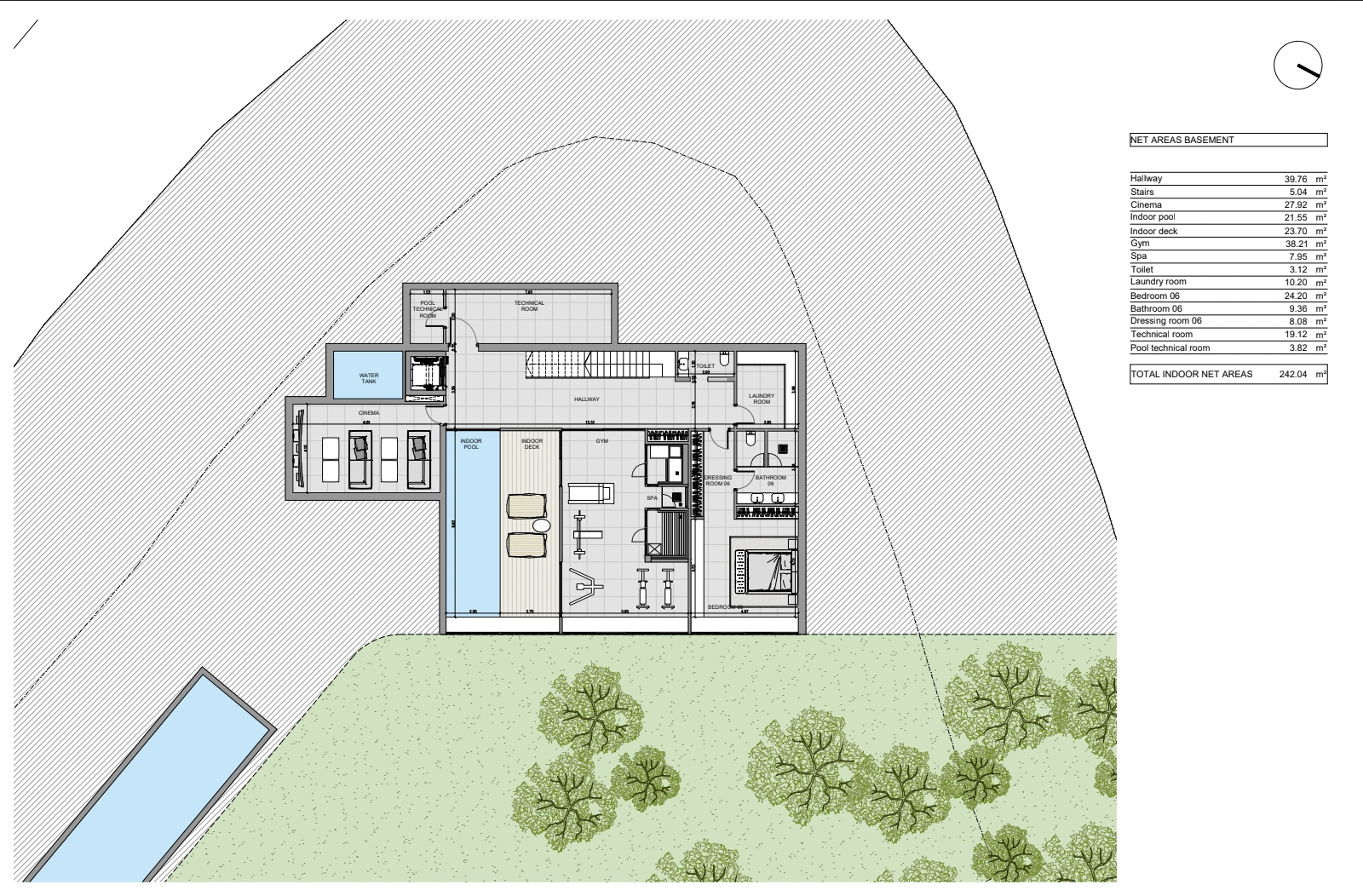 Das Untergeschoss disponiert ein weiteres Schlafzimmer mit Bad en suite und Ankleidezimmer, ein beeindruckendes Heimkino, einen Indoorpool, einen Fitnessraum, einen Wellnessbereich mit Sauna sowie den Technikraum.