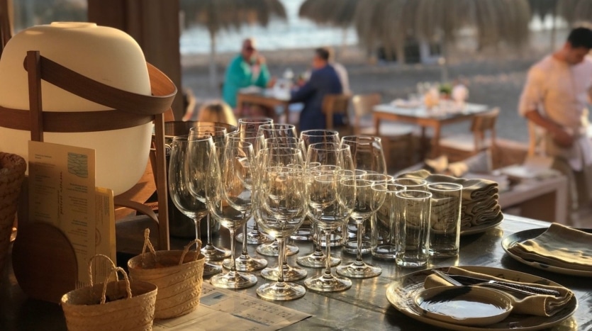 Die Farben des Interieurs wurden an den Strand angepasst, selbst die Kellner tragen sandfarbene Uniformen. Der bekannte Mallorca Koch Gerhard Schwaiger hat als Berater das Küchenkonzept geliefert, jedoch kocht er aber weiterhin nur in seinem eigenen Restaurant Nähe Palmas Son Moix Stadion im Schwaigers Xino’s. Die Hauptgerichte liegen ca. zwischen 20 und 30 Euro, es gibt aber auch Salate, Currywurst, Snacks und einiges mehr auf der vielfältigen Karte.