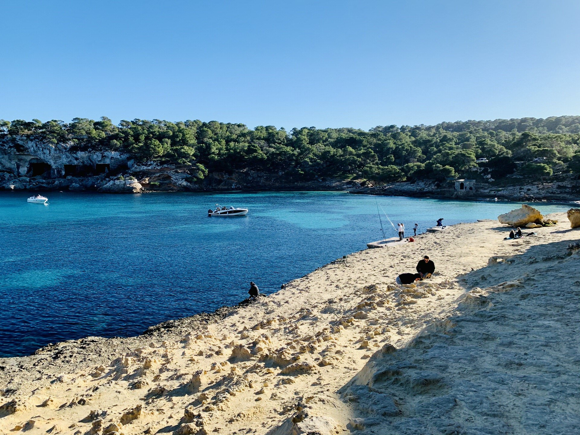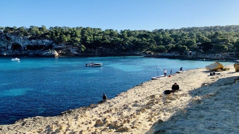 Aber was kann man in so einer Zeit Schöneres machen, als Mallorcas Natur genießen? Die Insel bietet unzählige Wandermöglichkeiten am Meer oder in den Bergen und das blaue Meer garniert mit einem Blick auf die schneebedeckten Hügel der Tramuntana in diesen Tagen, ist nicht zu toppen! Besonders für Familien können wir die einfache aber wunderschöne Wanderung von Port Portals Vells zu den Höhlen empfehlen und, wenn Sie noch weiter laufen möchten, bis zum Leuchtturm. Die leichte Küstenwanderung beginnt in Sol de Mallorca, oberhalb der 3-Finger-Bucht Portals Vells und man parkt sein Auto in der Avinguda Portals Vells wo bei der Nr. 40 direkt eine Treppe nach unten führt und den Blick frei gibt auf feinen Sand, bizarre Felsen und türkisgrünes Wasser. Rechts von der Plattform erreicht man dann auf einem Trampelpfad nach wenigen Minuten die Platja del Rey und gelangt von dort auf einer holprigen Straße kurze Zeit später zur Platja del Mago. Bei dem Restaurant führt nun vom Strand Es Mago links ein Klippenpfad auf eine lange, terrassenförmige Ebene, von der die Sa Platgeta erreicht wird. Der Strand ist der größte und der am meisten besuchte an der Küste von Portals Vells. Vor allem an Wochenenden ankern hier viele Segel- und Motoryachten. Ziel der Crews ist das Fischrestaurant, das sich hier befindet.