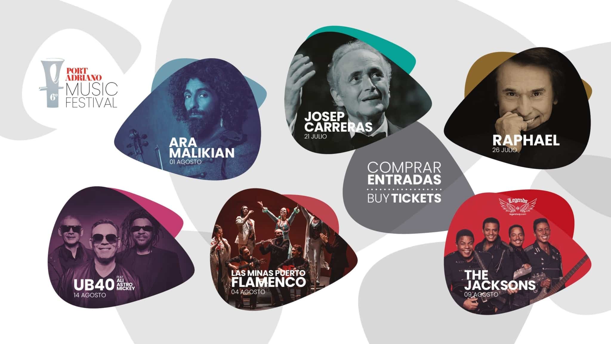 Auch in diesem Jahr präsentiert Port Adriano seine Sommerkonzerte, eines der wichtigsten Festivals im Mittelmeer, mit Auftritten von Josep Carreras mit dem Arts Symphony Orchestra und den Sopransängern Sabina Puértolas, Raphael, Ara Malikan, Las Minas Puerto Flamenco, The Jacksons und UB40 Feat. Ali, Astro & Mickey.